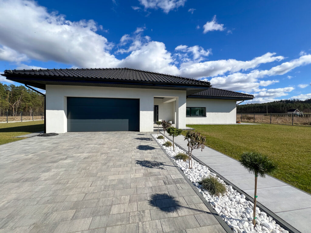 Nowoczesny dom parterowy z II stanowiskowym garażem w bryle budynku, słonecznym tarasem oraz dużym ogrodem w Polanowie !