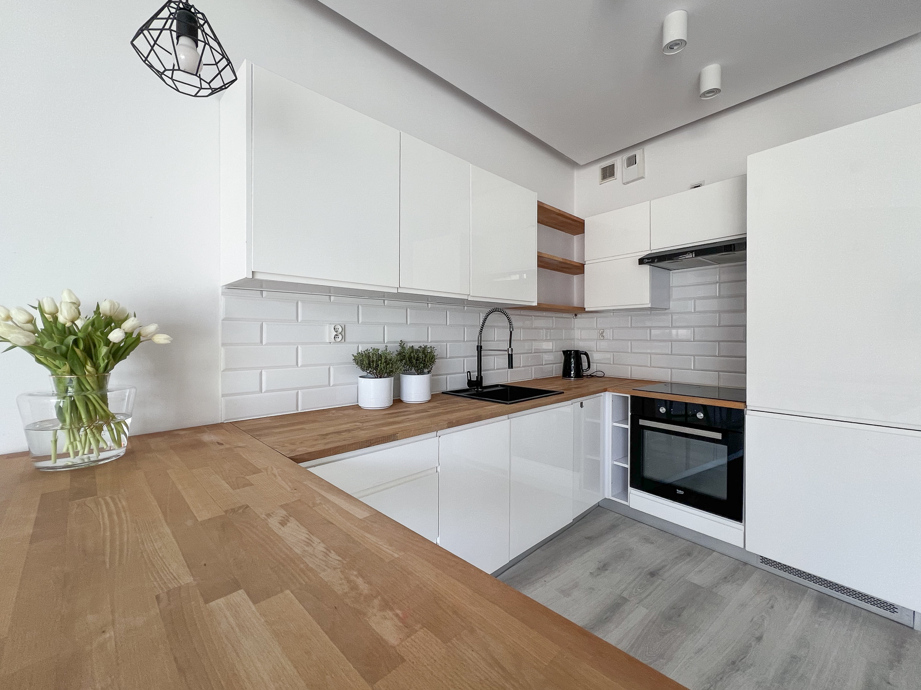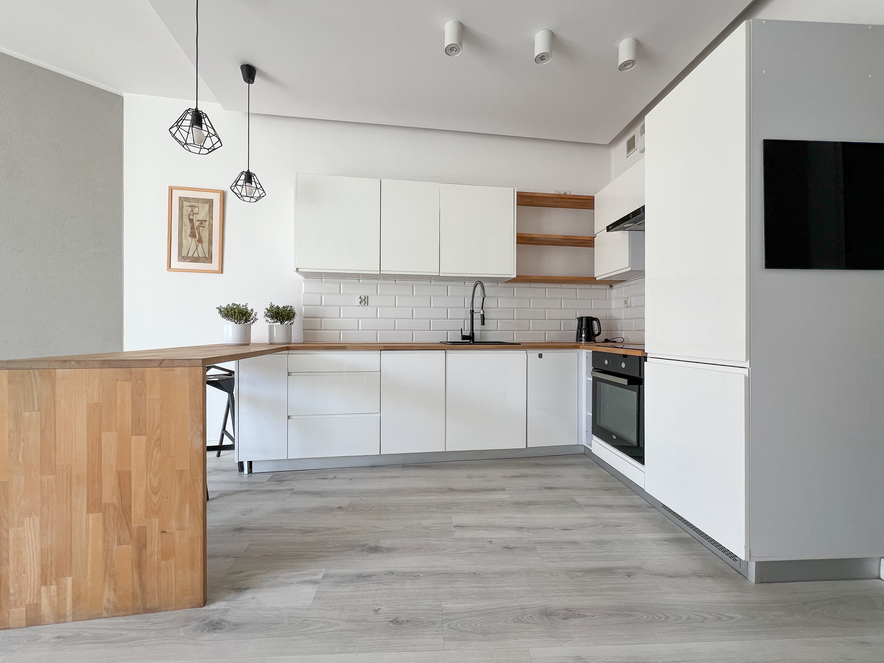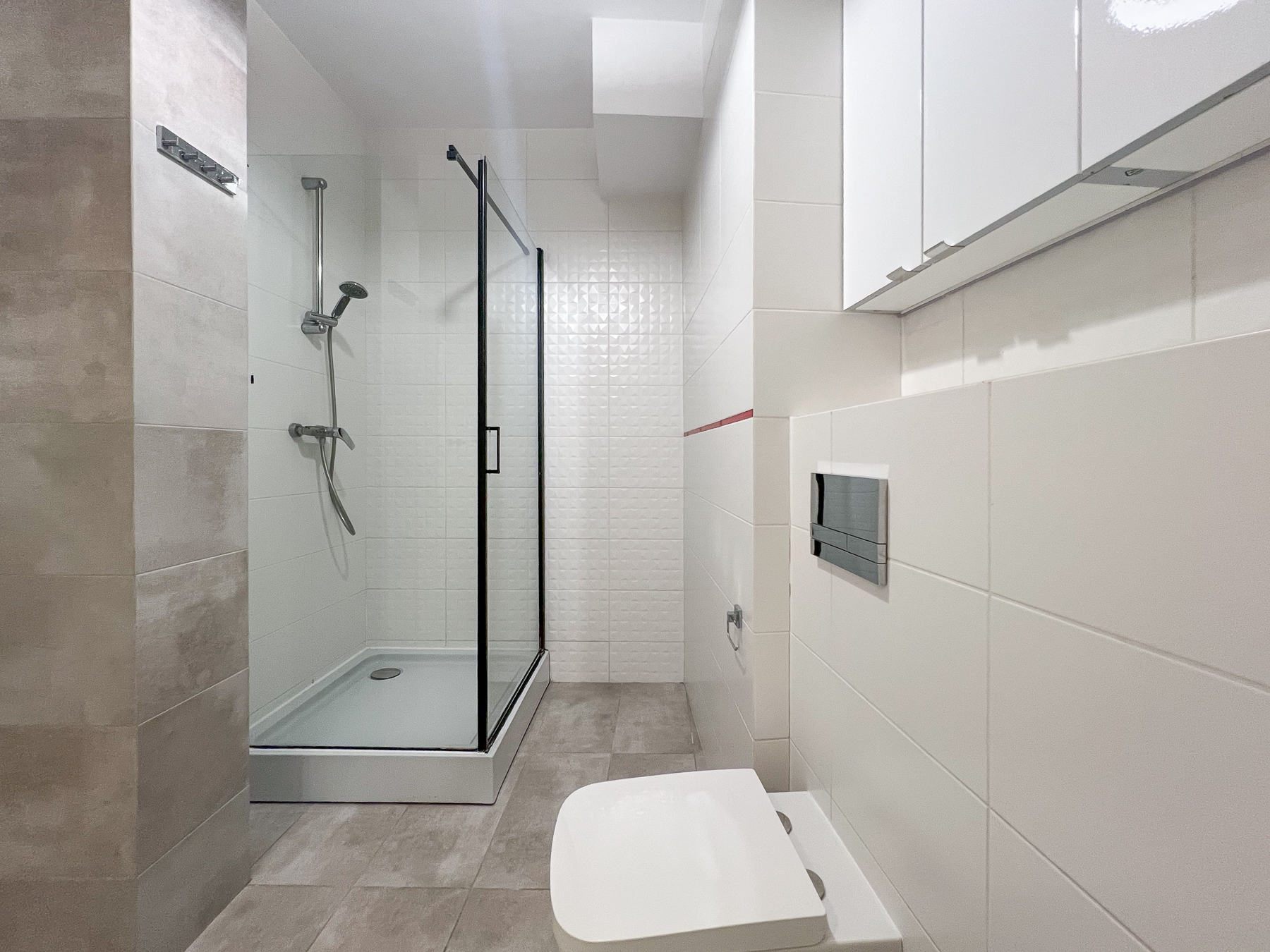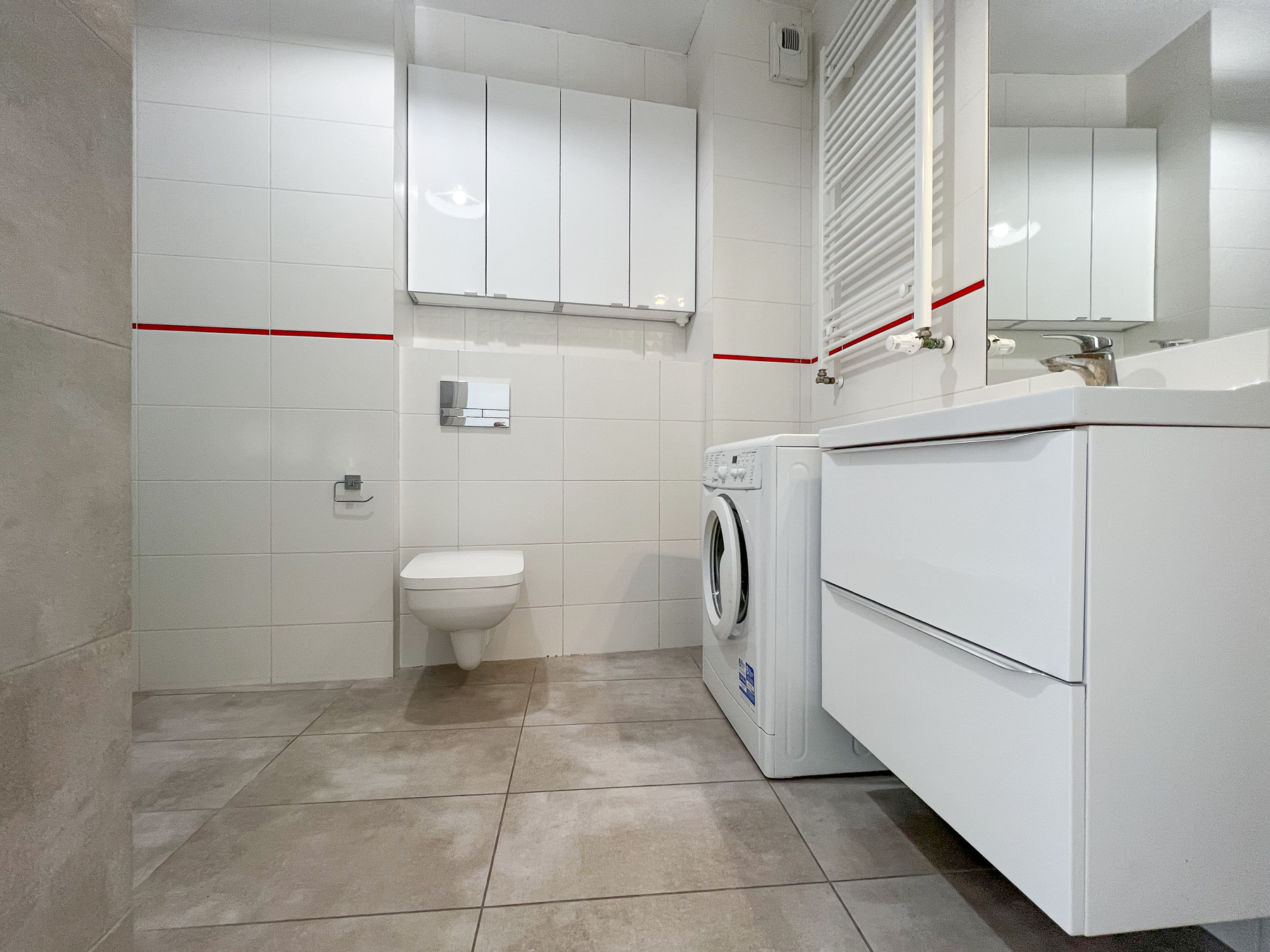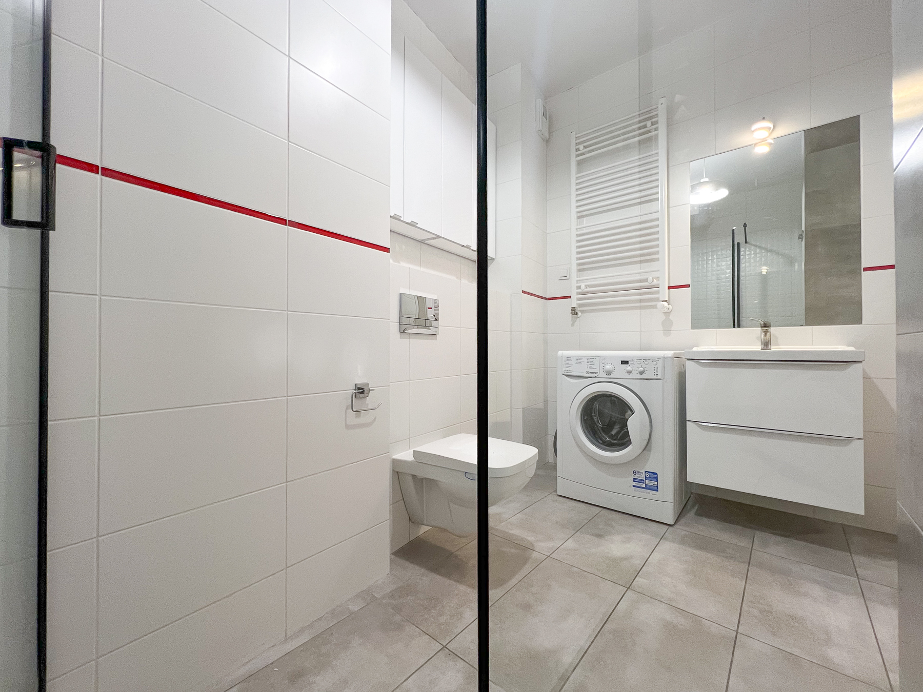 - Praktycznej łazienki połączonej z wc, z pralką, prysznicem oraz miejscem do przechowywania domowej chemii i kosmetyków,
