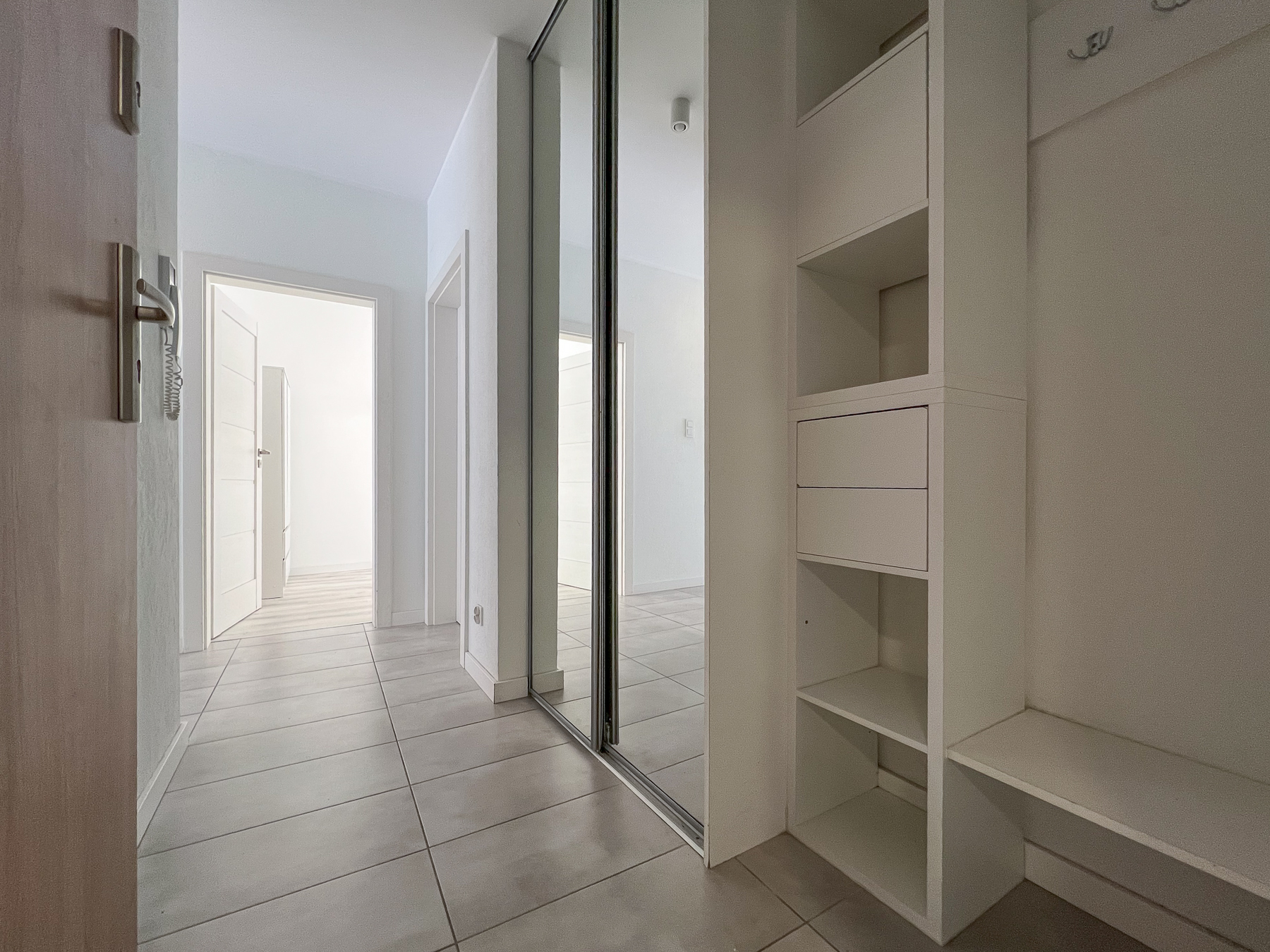 - Przedpokoju, pełniącego funkcję komunikacyjną z niezależnym wejściem do każdego z pokoi. Nadto w tej przestrzeni wkomponowano pojemną szafę do przechowywania niezbędnych rzeczy osobistych.