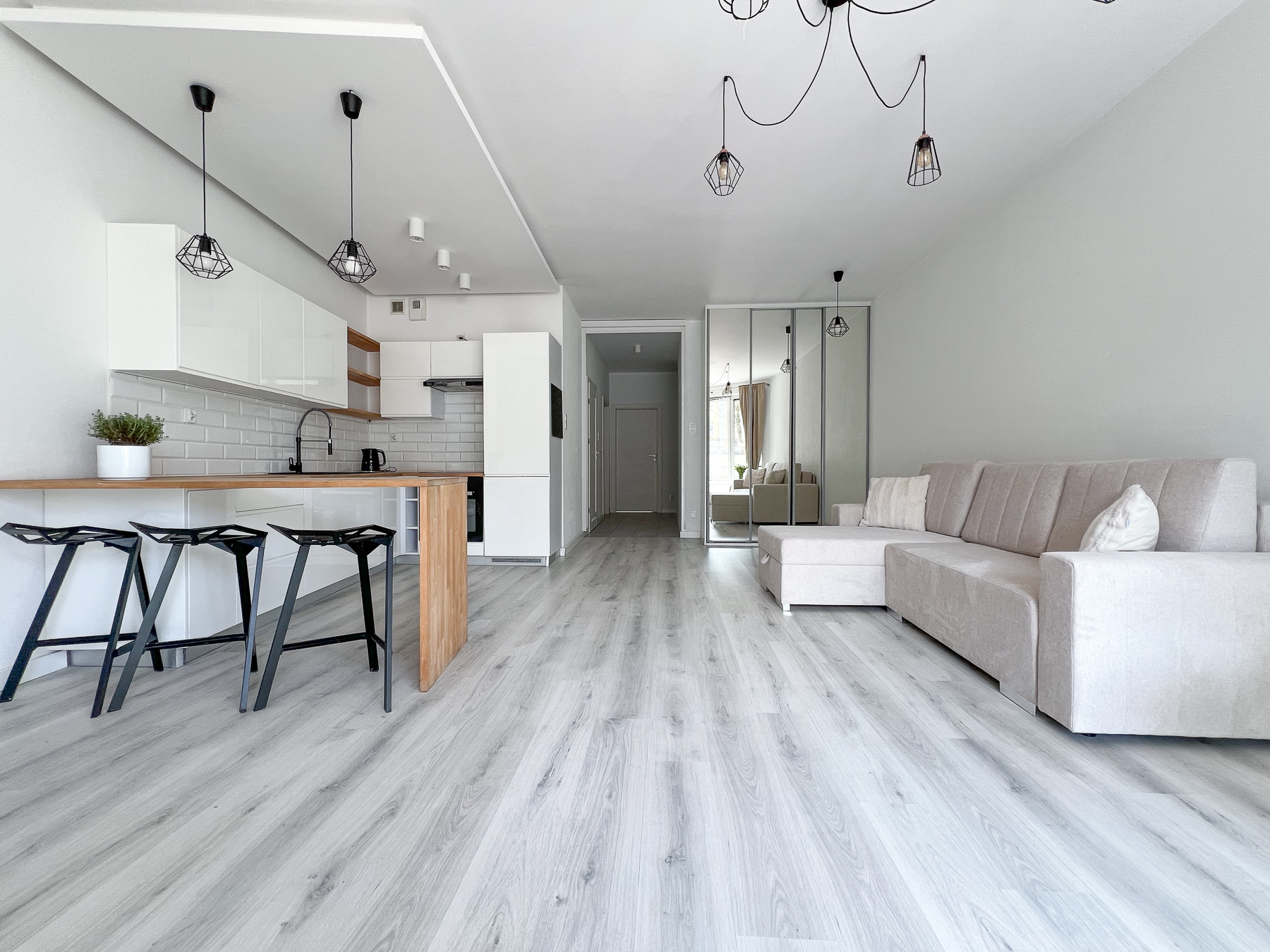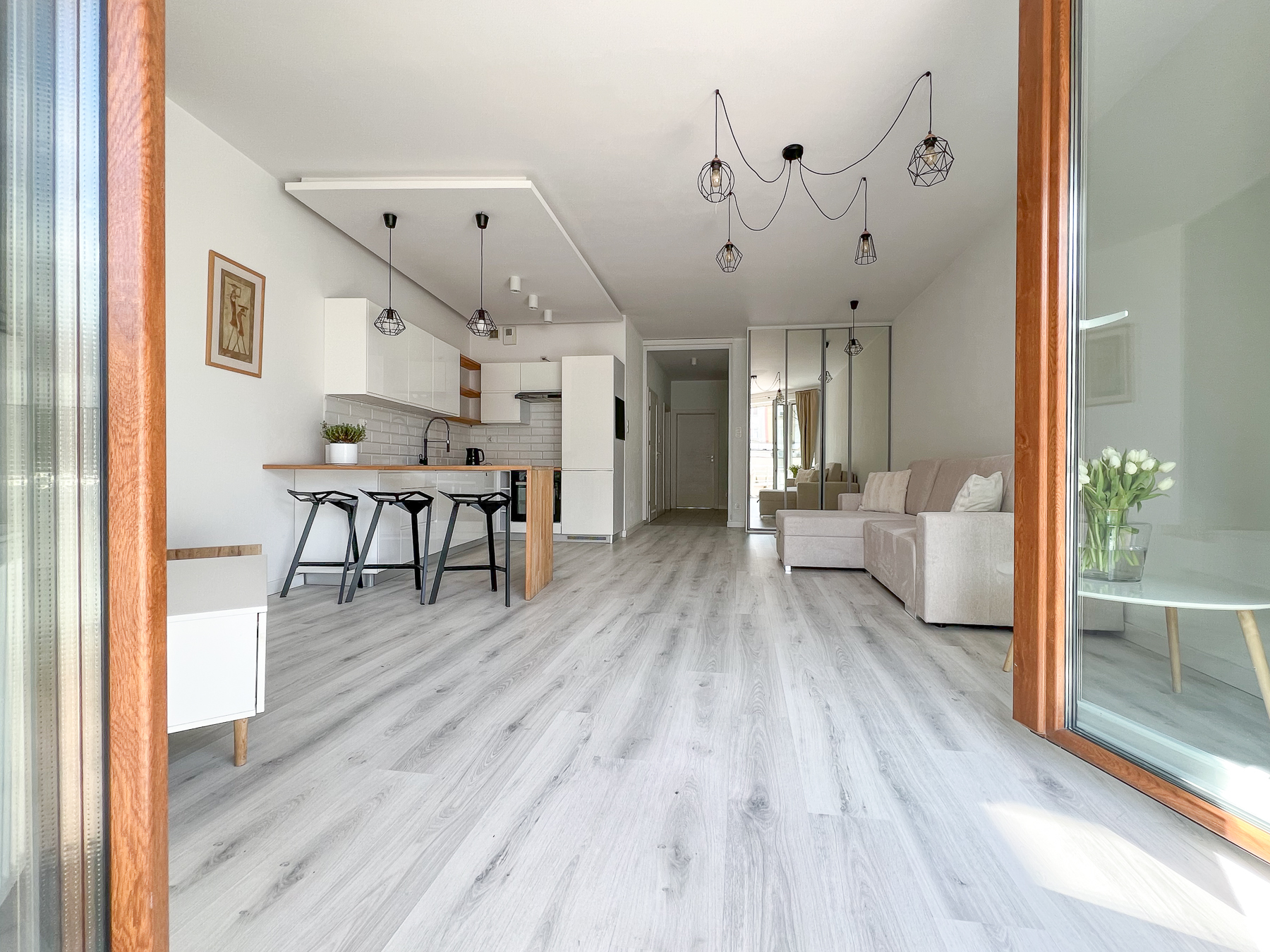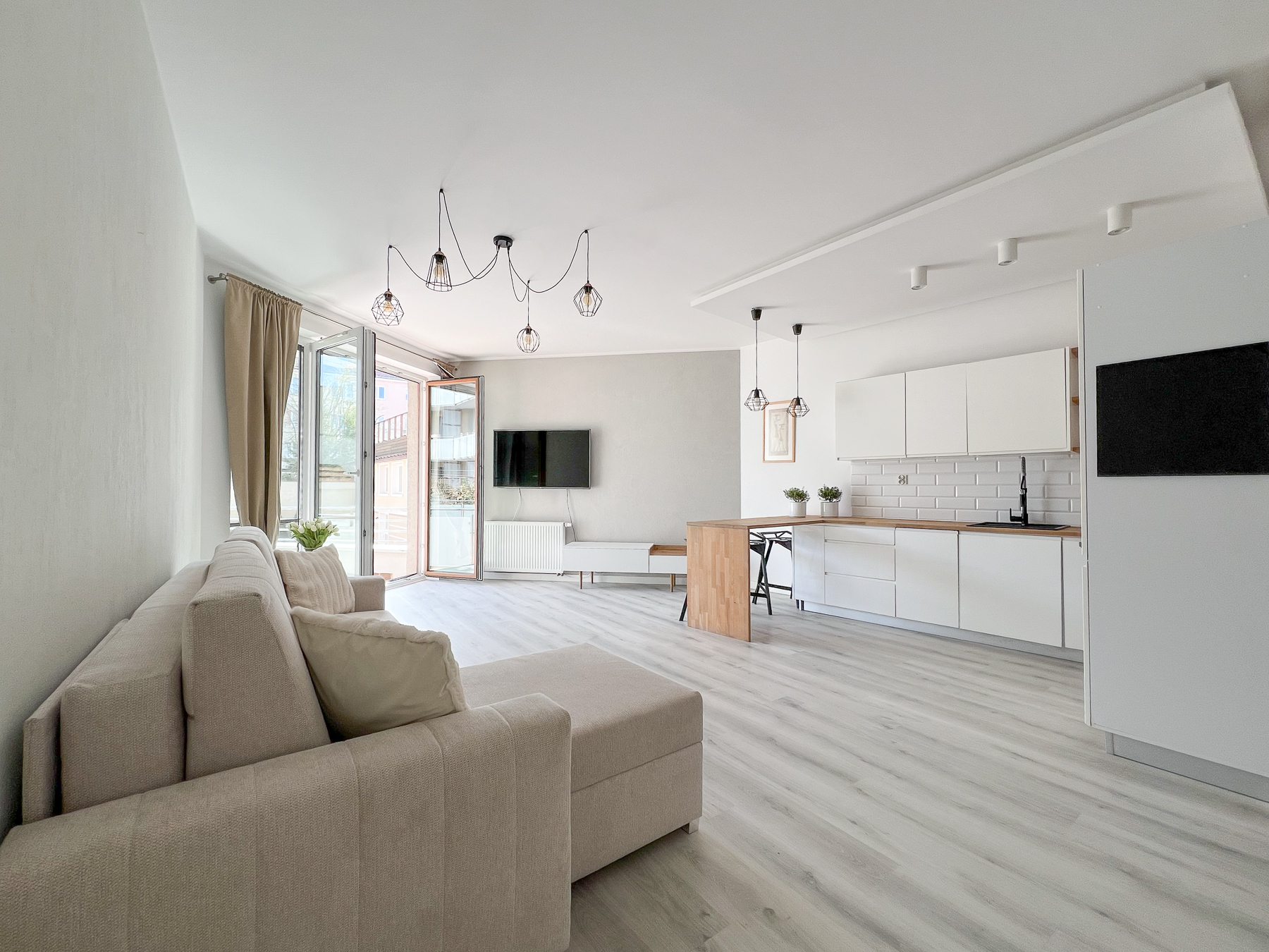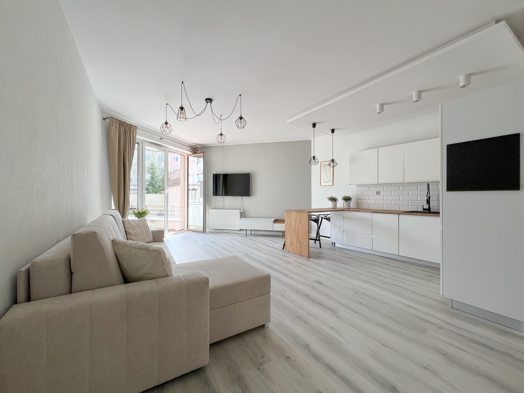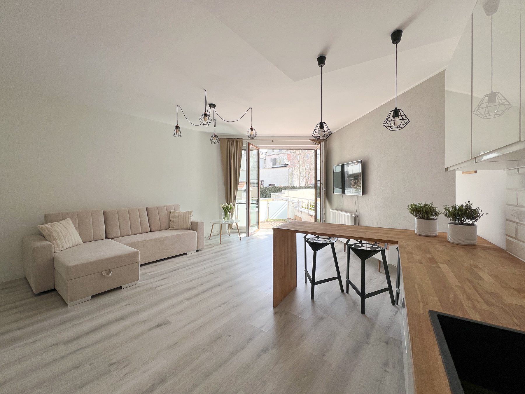 - Przestronnego pokoju dziennego połączonego z aneksem kuchennym, z wygodną strefą wypoczynkową oraz wyjściem na słoneczny taras,