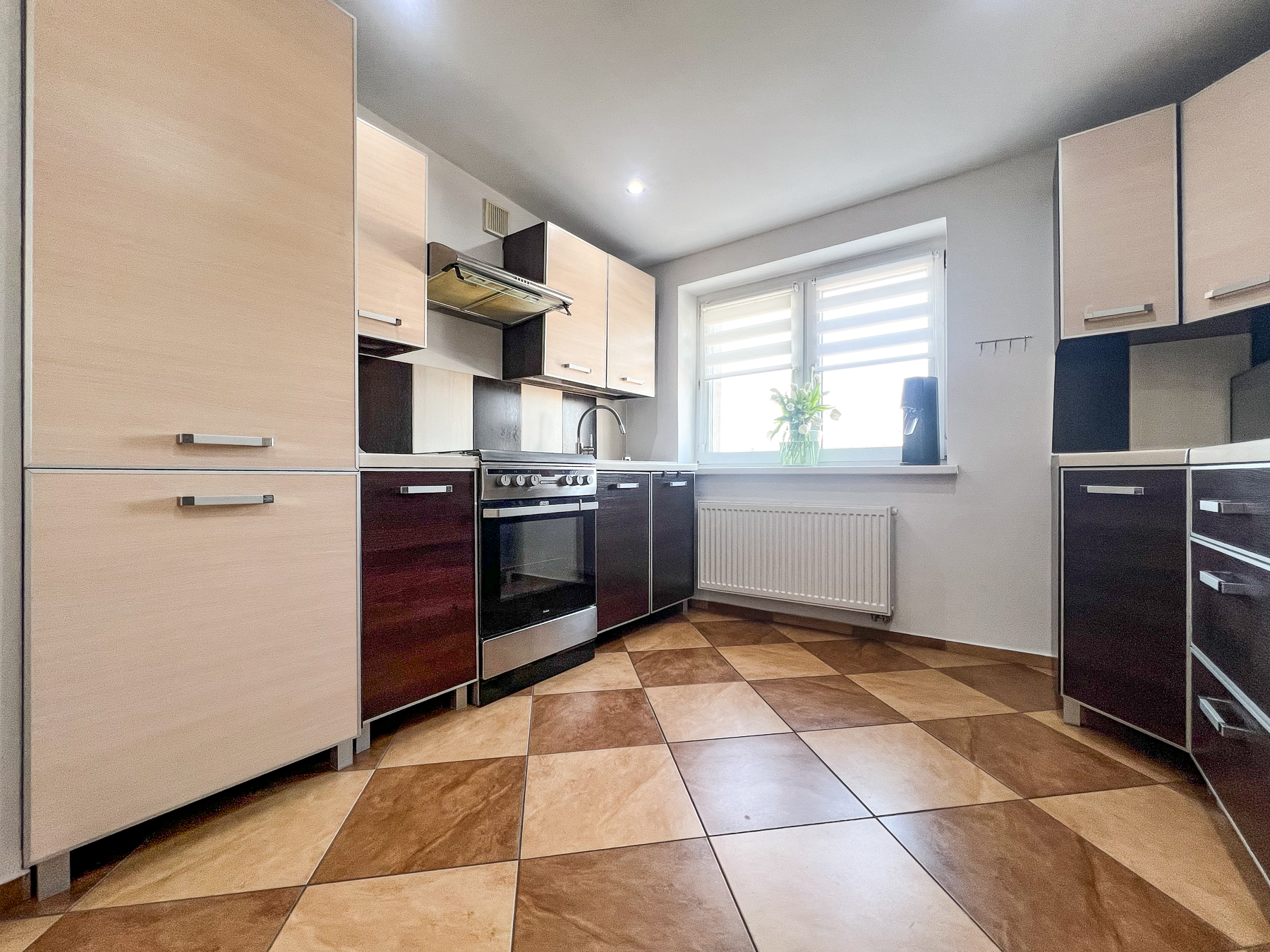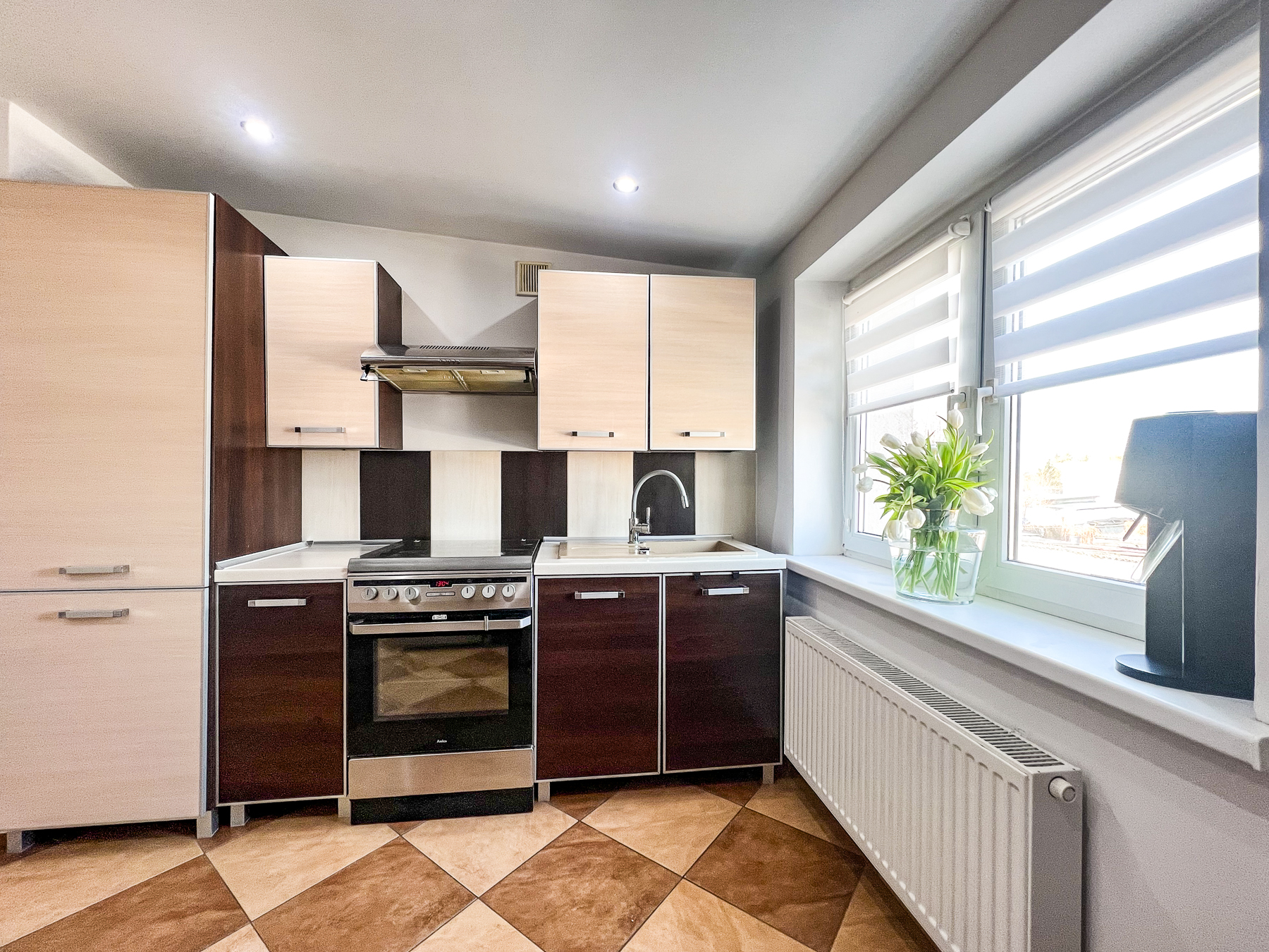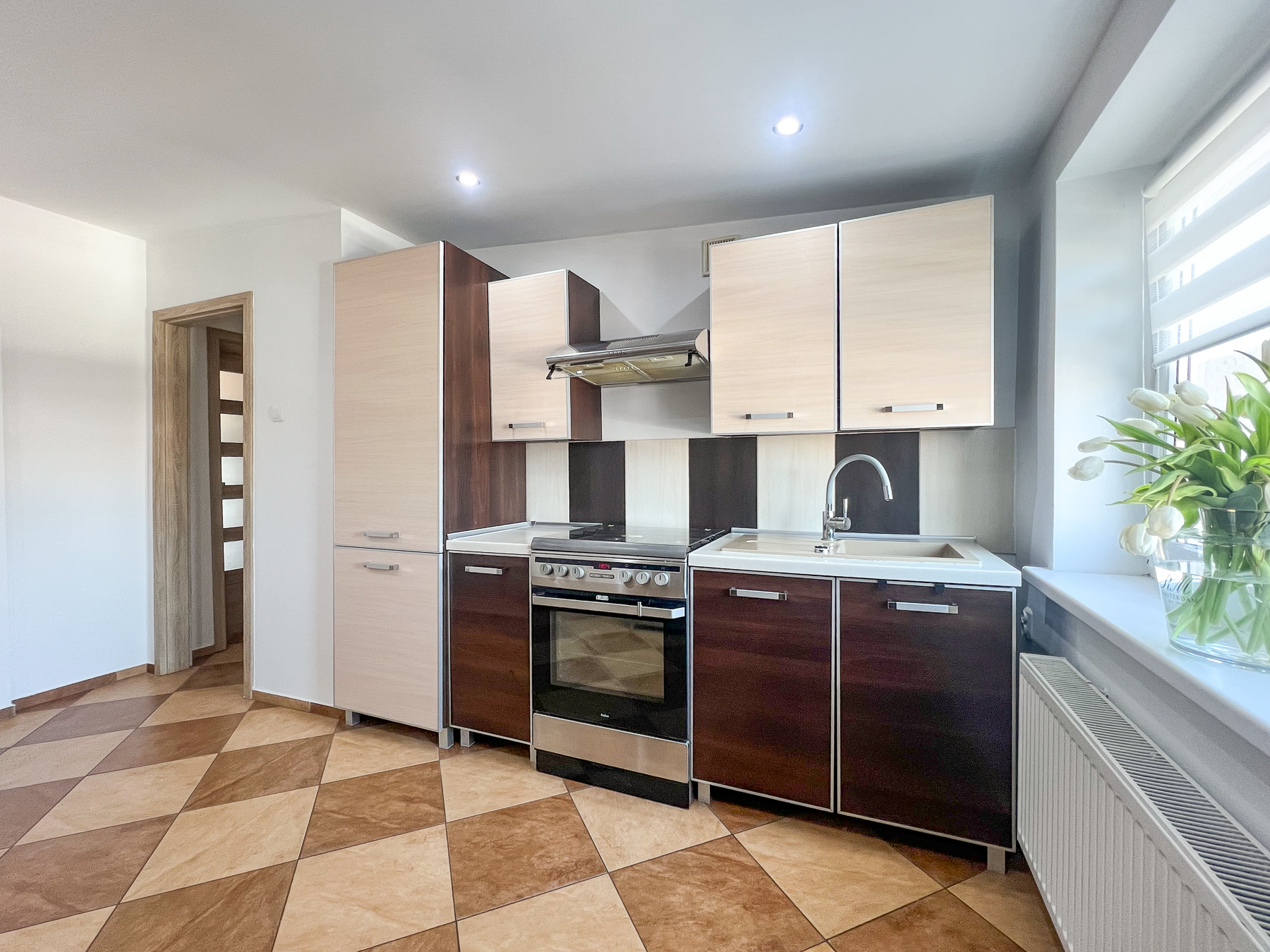 Kuchnia – widna, przestronna, z dużą wystawą okienną, w pełni wyposażona w zabudowę kuchenną oraz sprzęt AGD: płytę z piekarnikiem, okap, lodówkę.