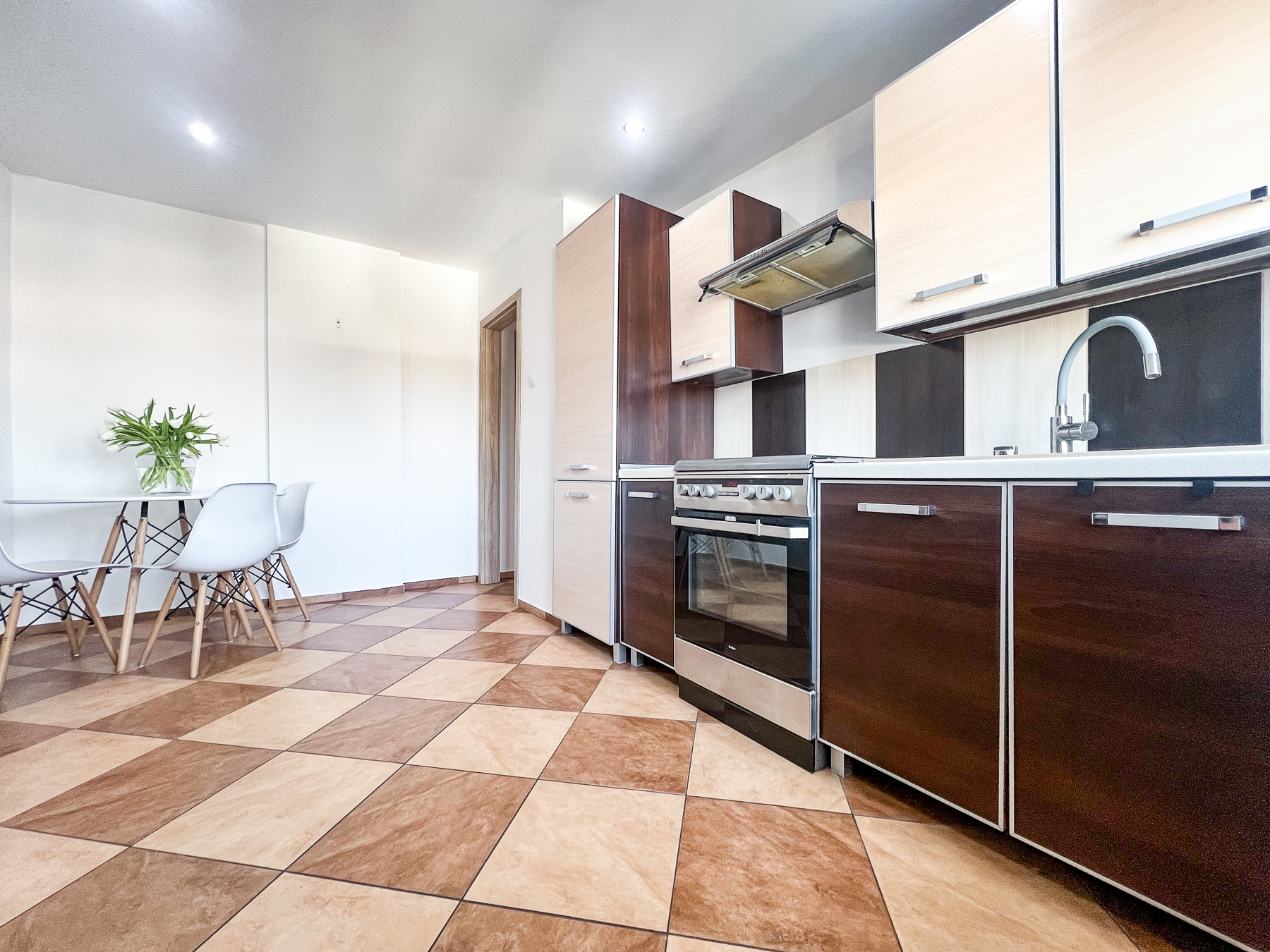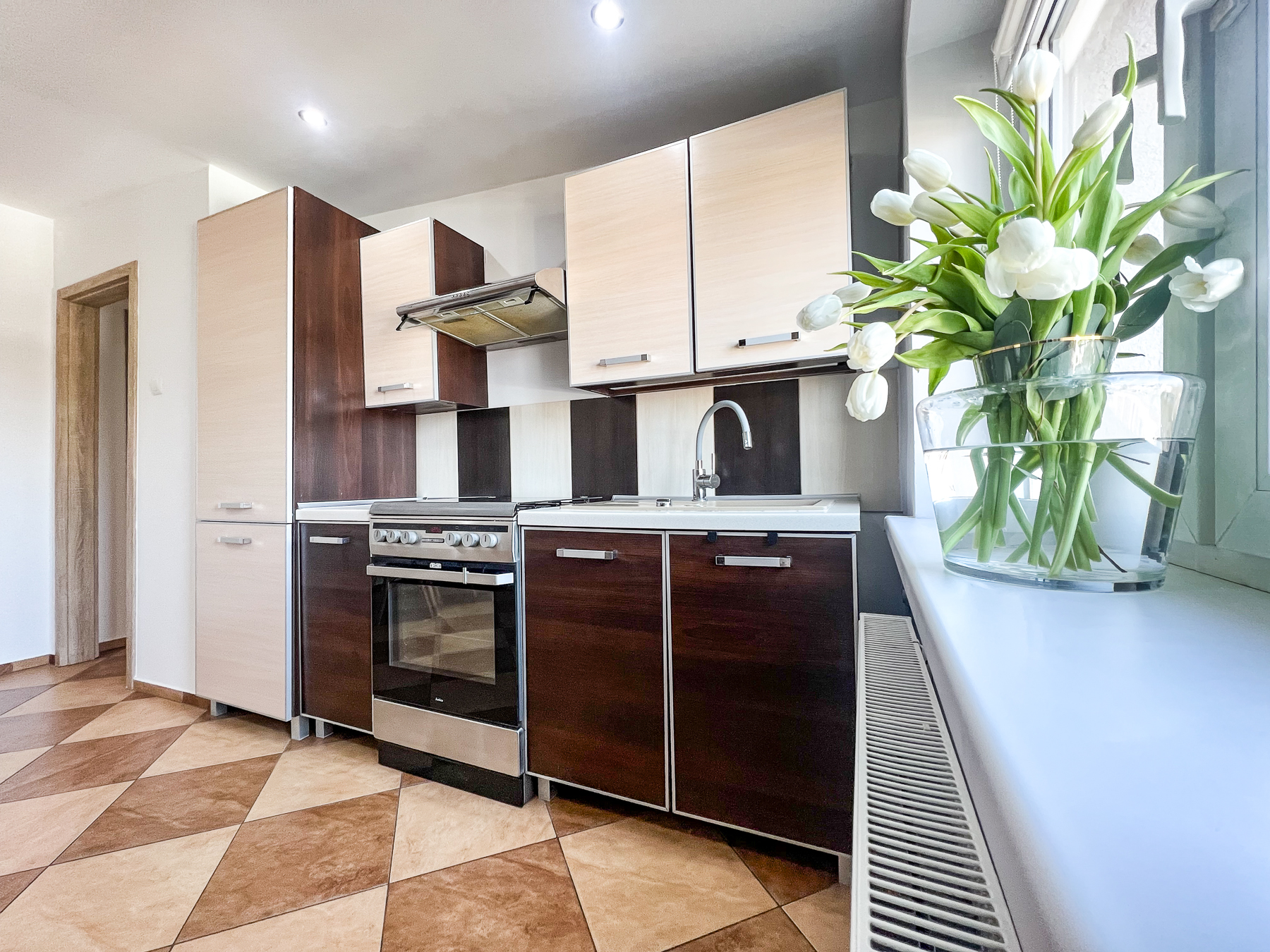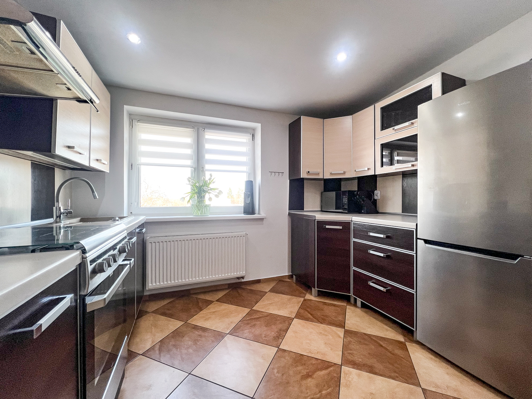 Kuchnia – widna, przestronna, z dużą wystawą okienną, w pełni wyposażona w zabudowę kuchenną oraz sprzęt AGD: płytę z piekarnikiem, okap, lodówkę.