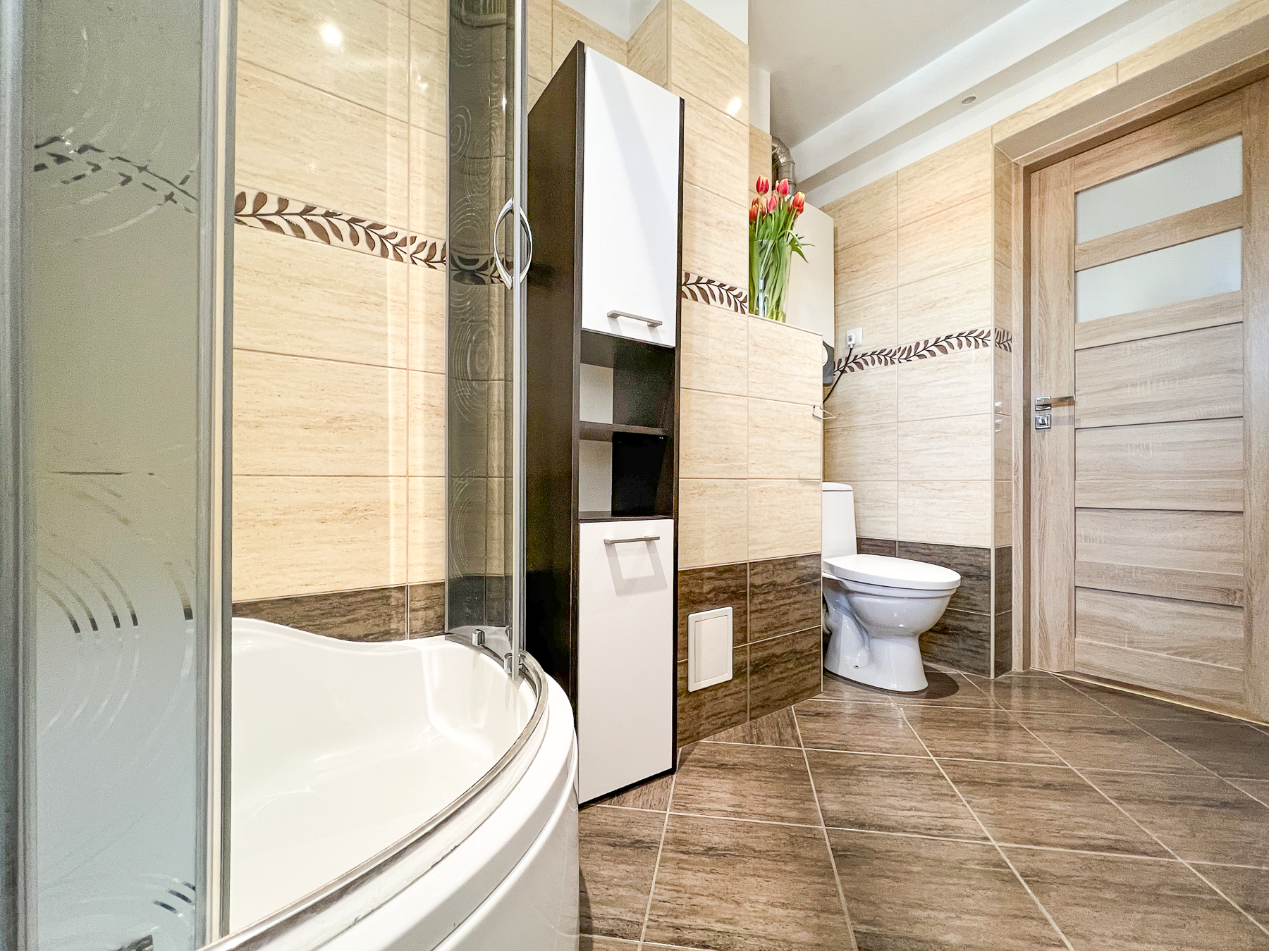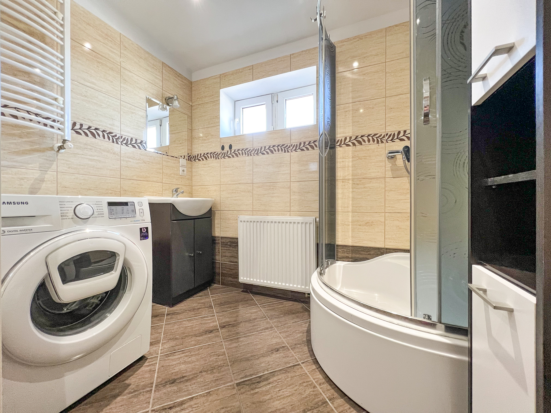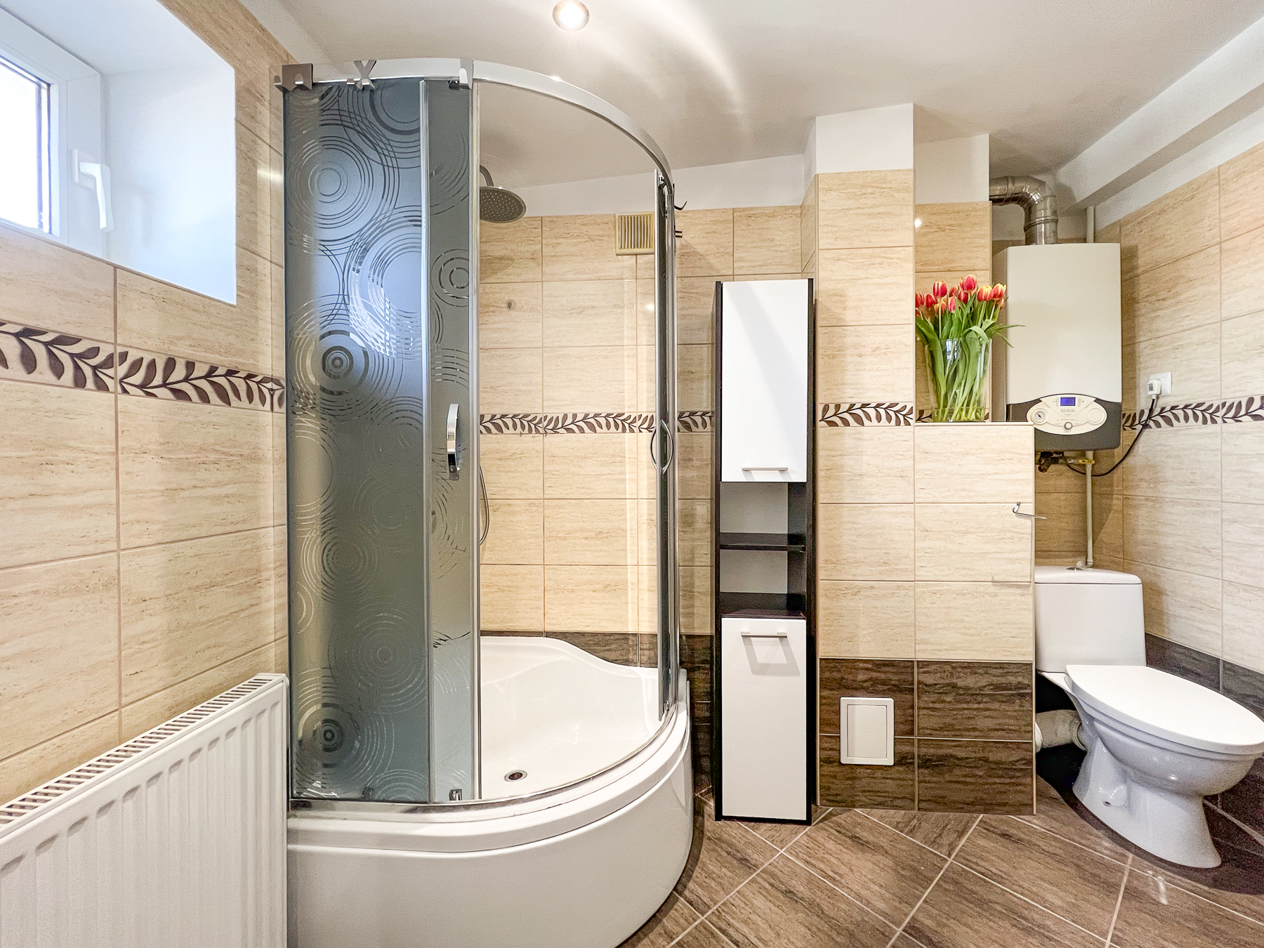 Łazienka – z oknem, dużym narożnym prysznicem, połączona z wc. Komfortowa przestrzeń ułatwia codzienne użytkowanie (szer. 3 m, dł. 4,30 m).