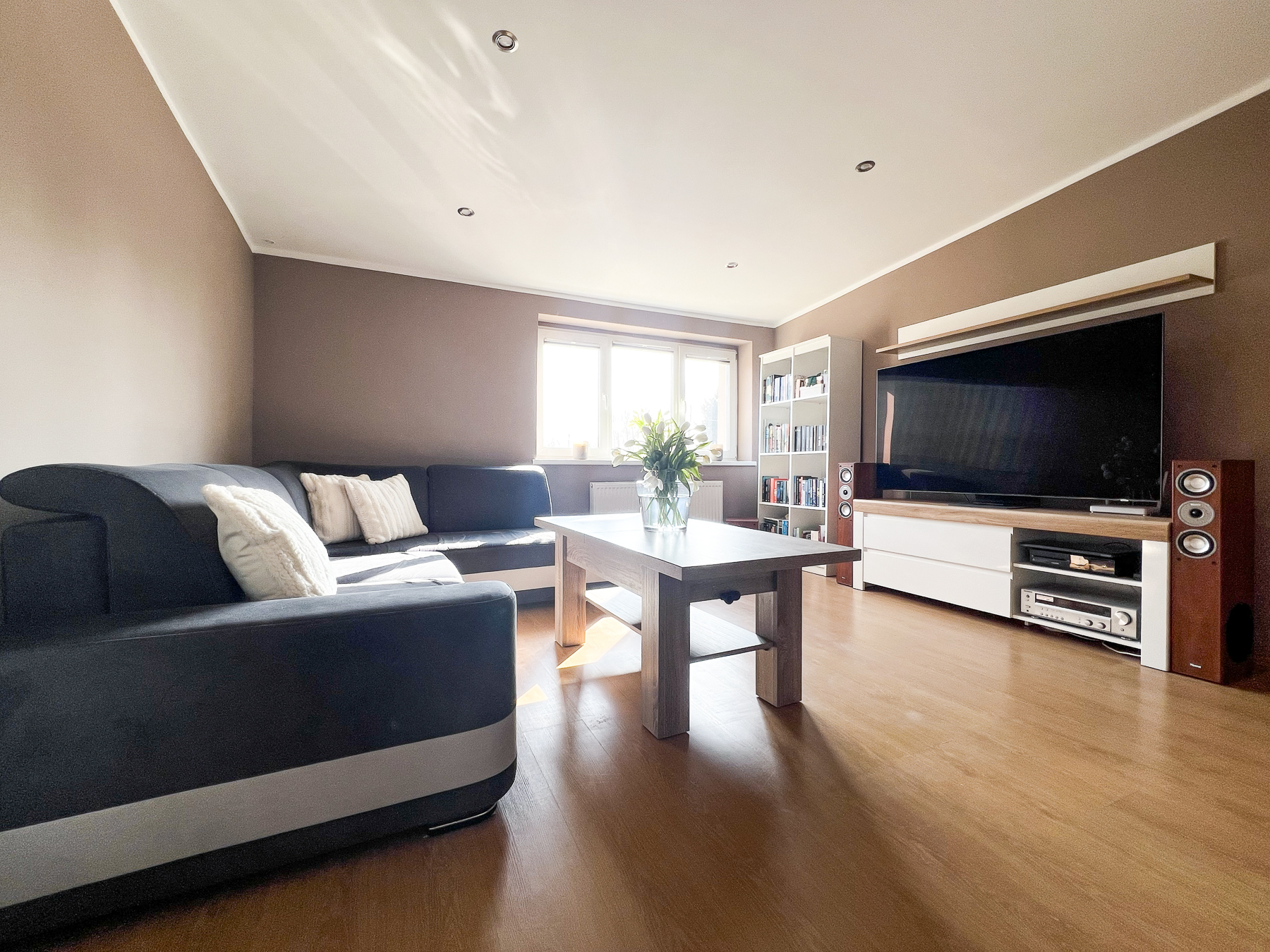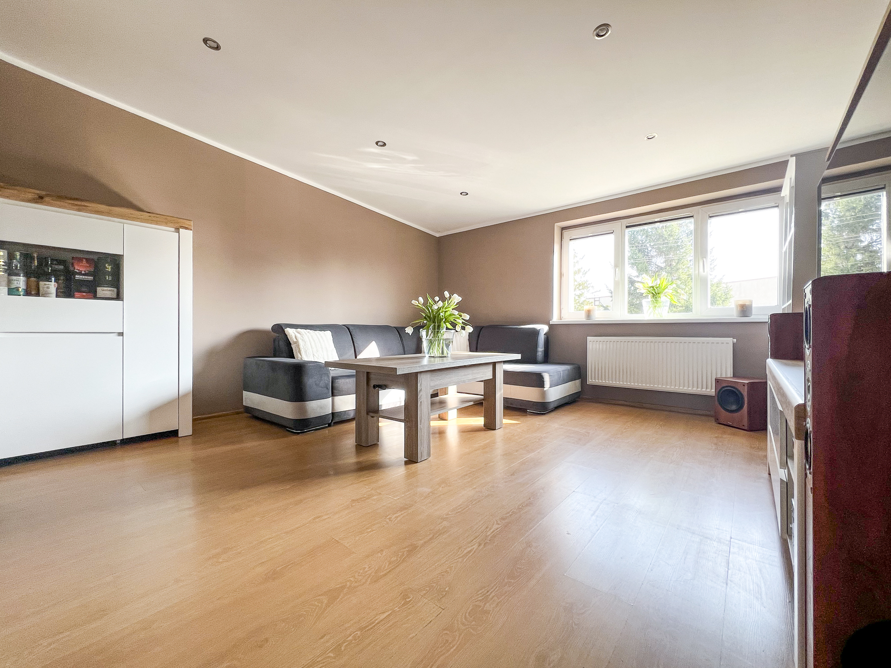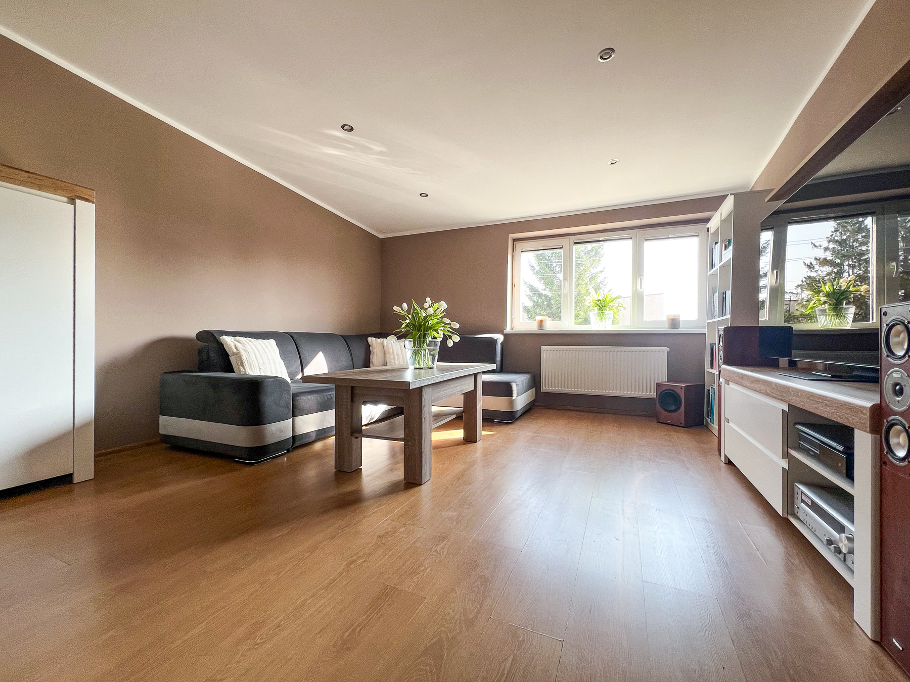 Pokój dzienny – przestronny, ustawny, naturalnie doświetlony dzięki dużym oknom (pow. ok. 19 m2).