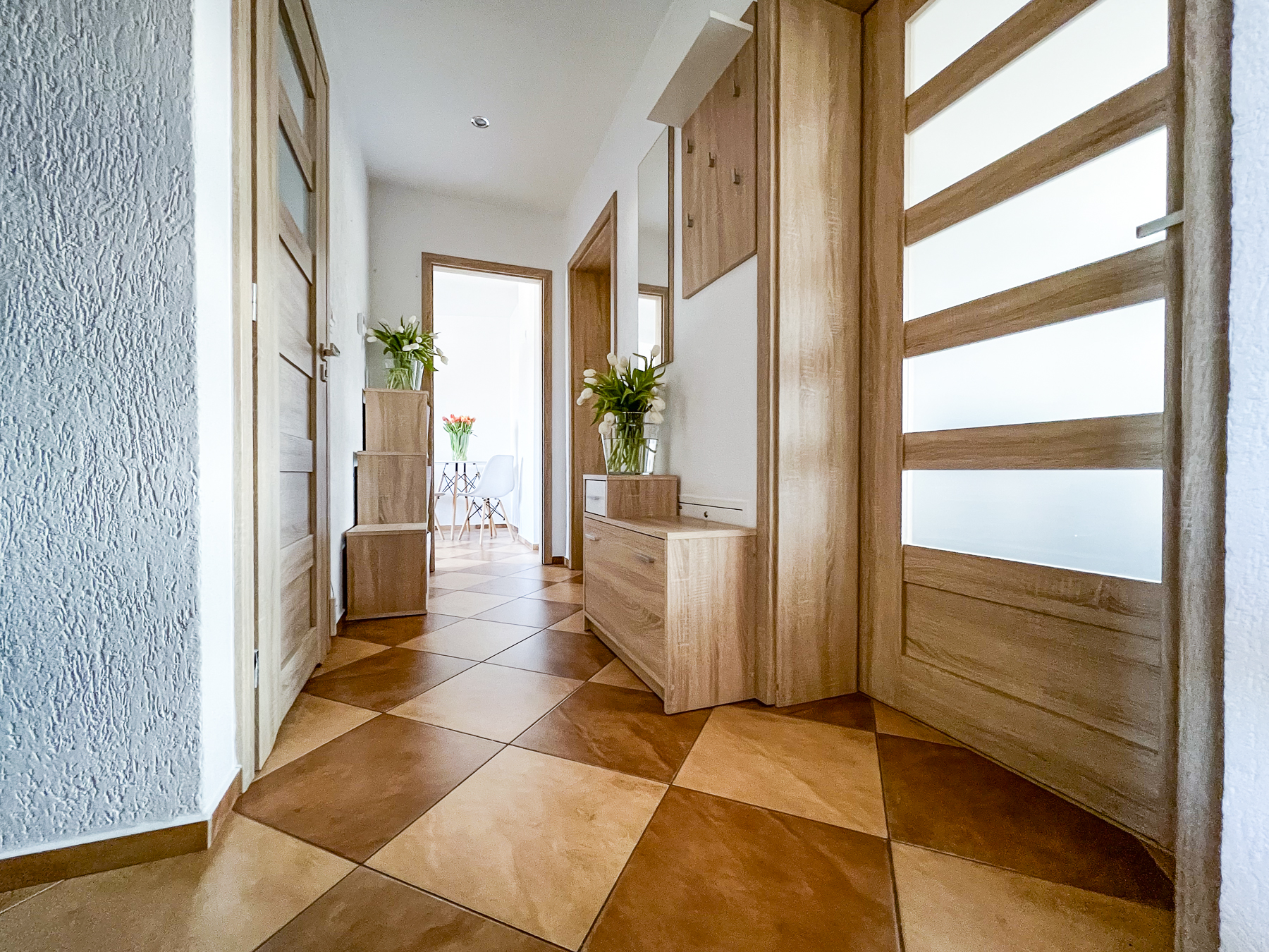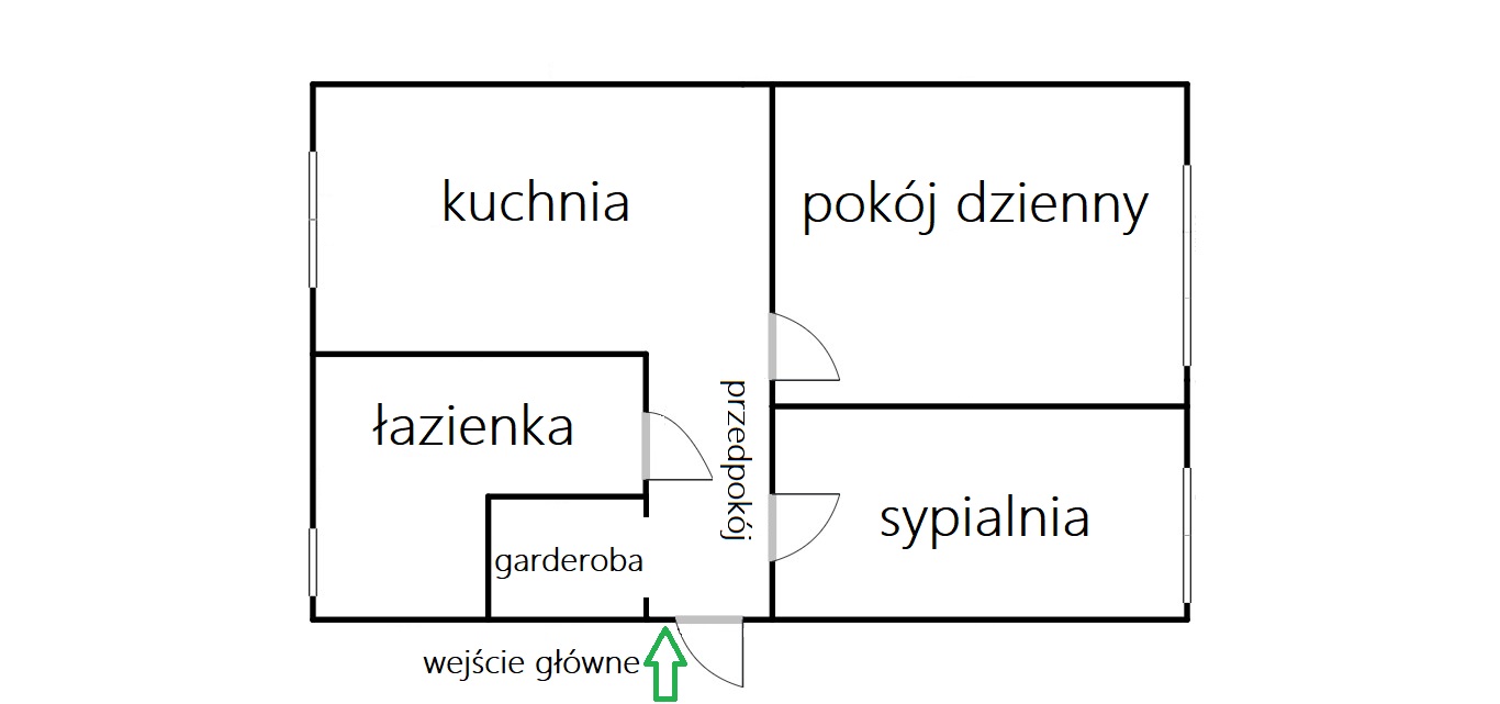 Przedpokój – pełni funkcję komunikacyjną, z osobnym wejściem do każdego z pomieszczeń (pow. ok. 3,90 m2), przy wejściu do mieszkania szafa wnękowa, gł. 1 m, szer. 85 cm.