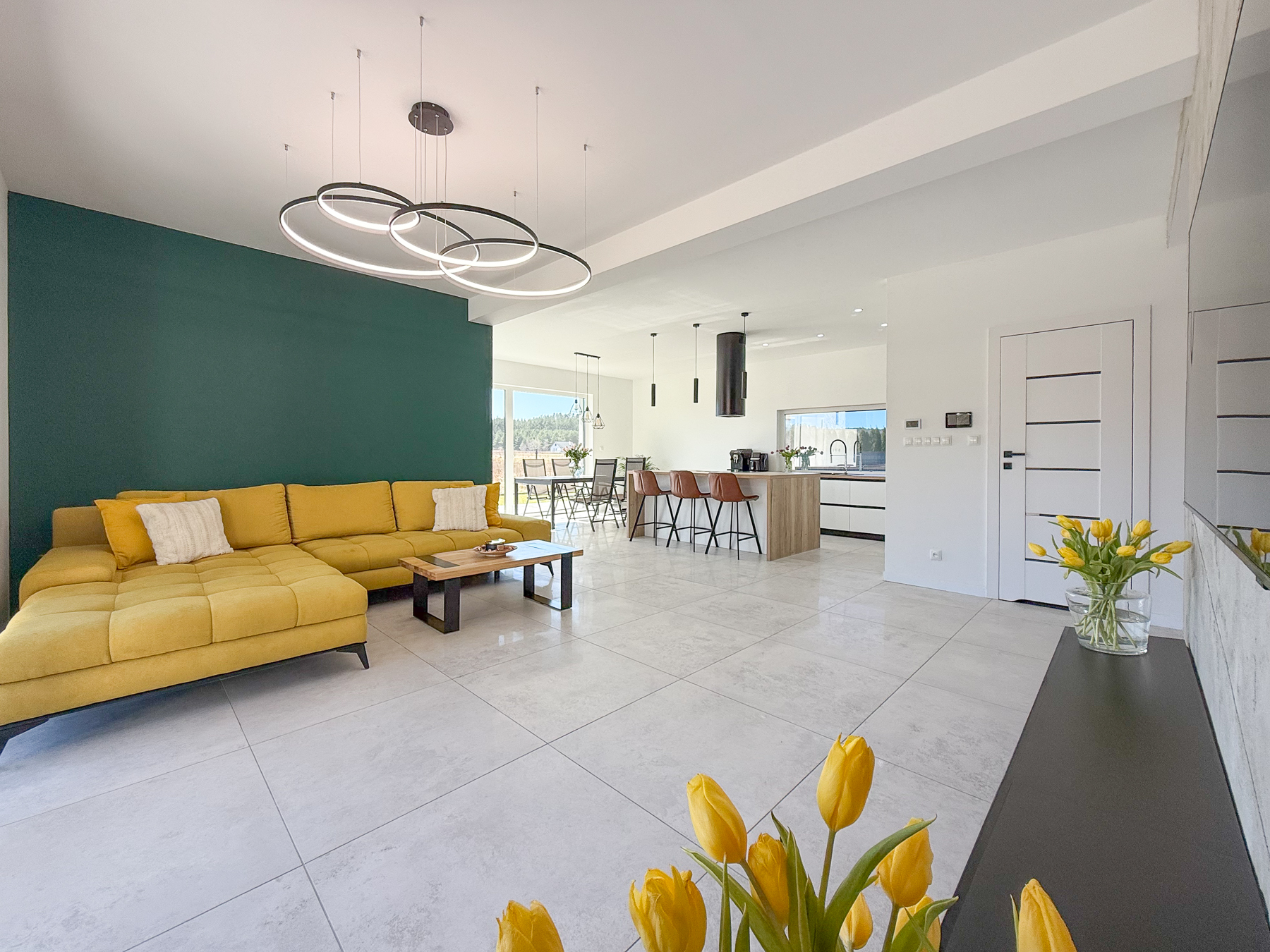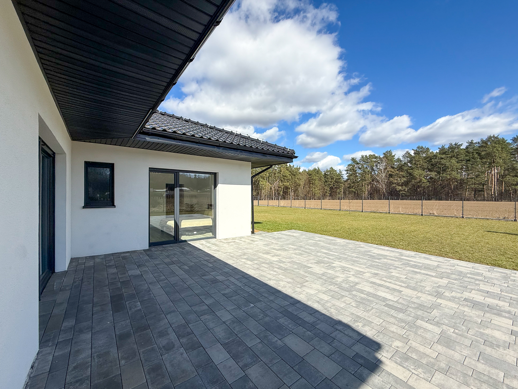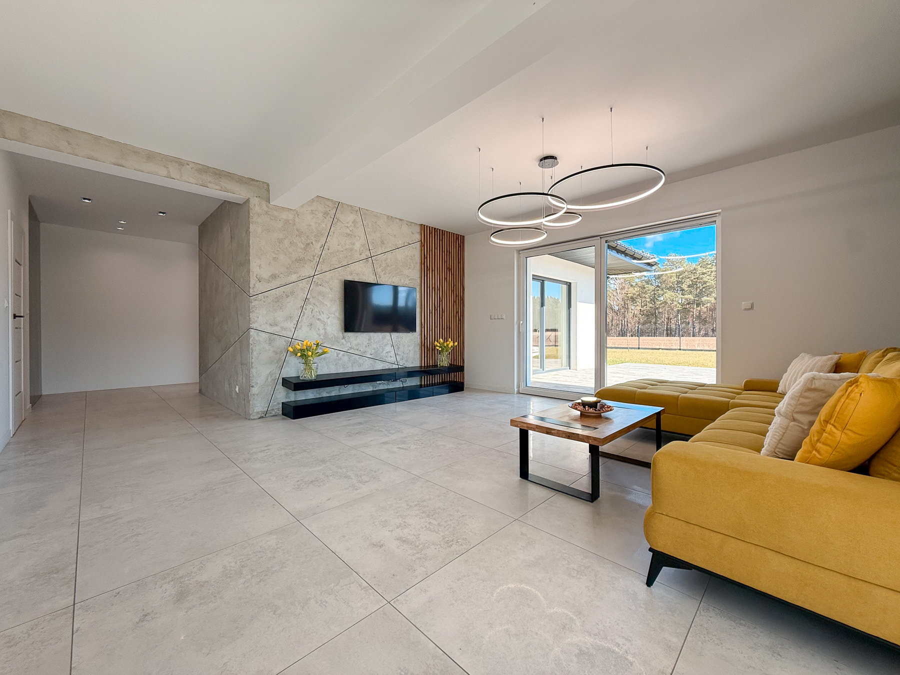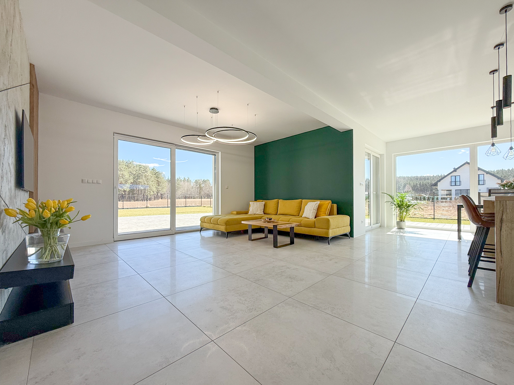 - salon o powierzchni 27,28 m2 urzeka swoją przestronnością. Z salonu wyjście na taras, zewnętrzną strefę wypoczynku z widokiem na las rozciągający się w oddali,