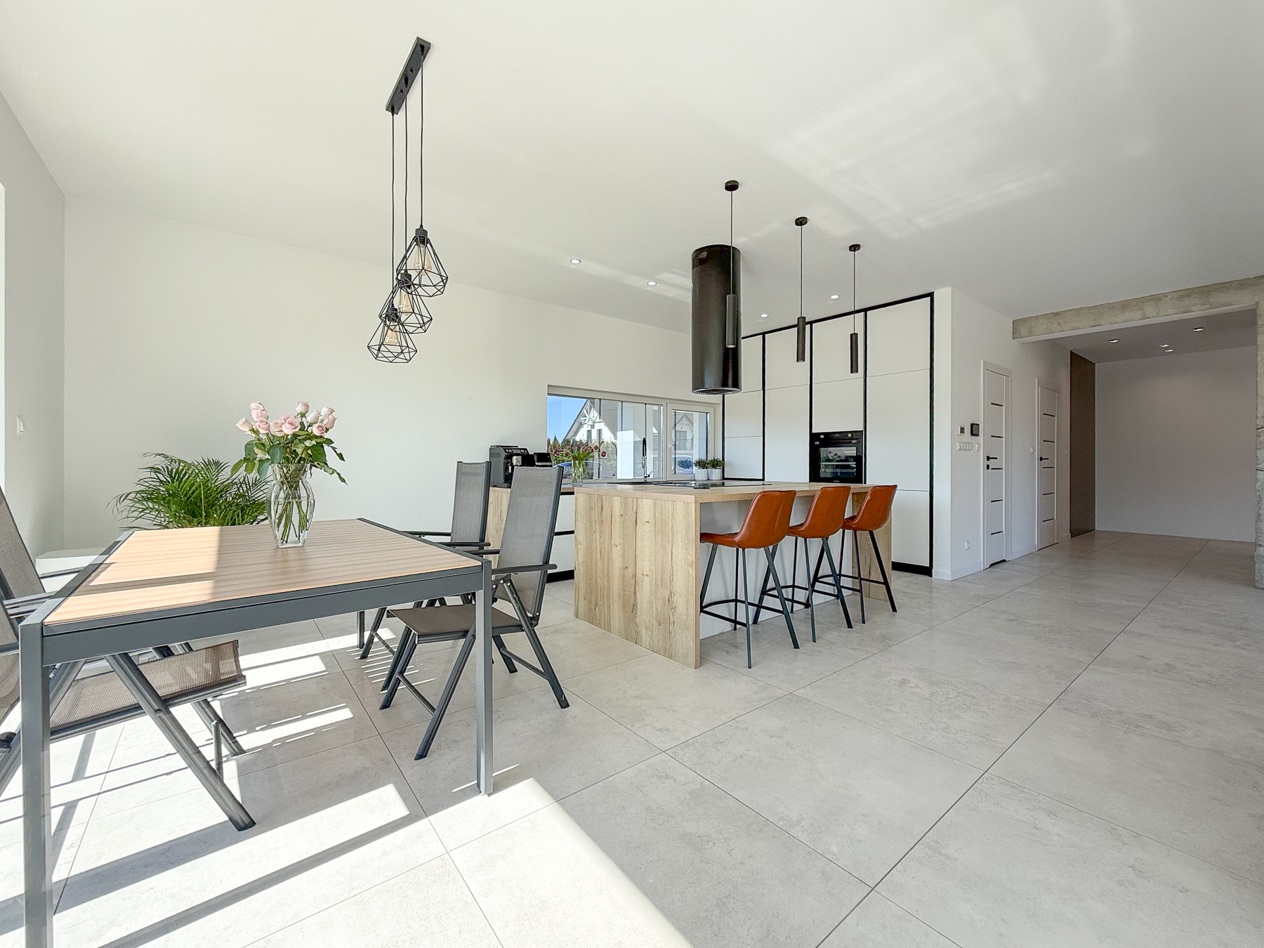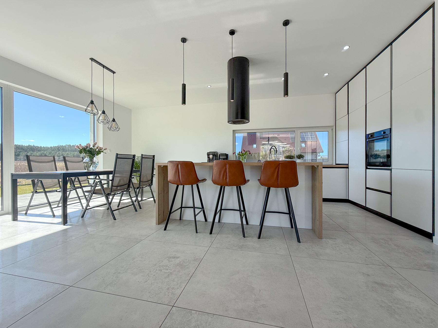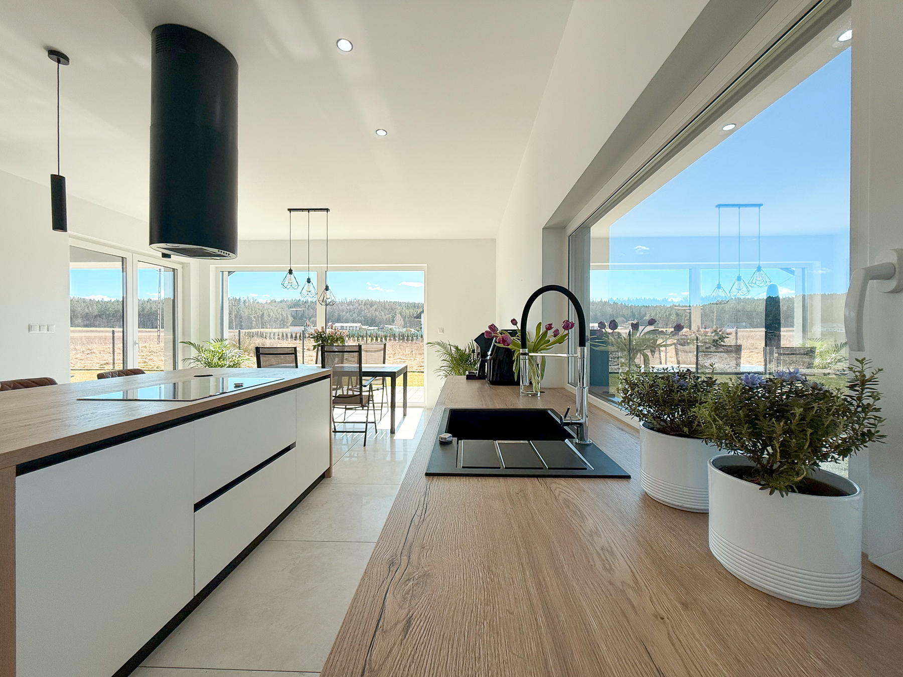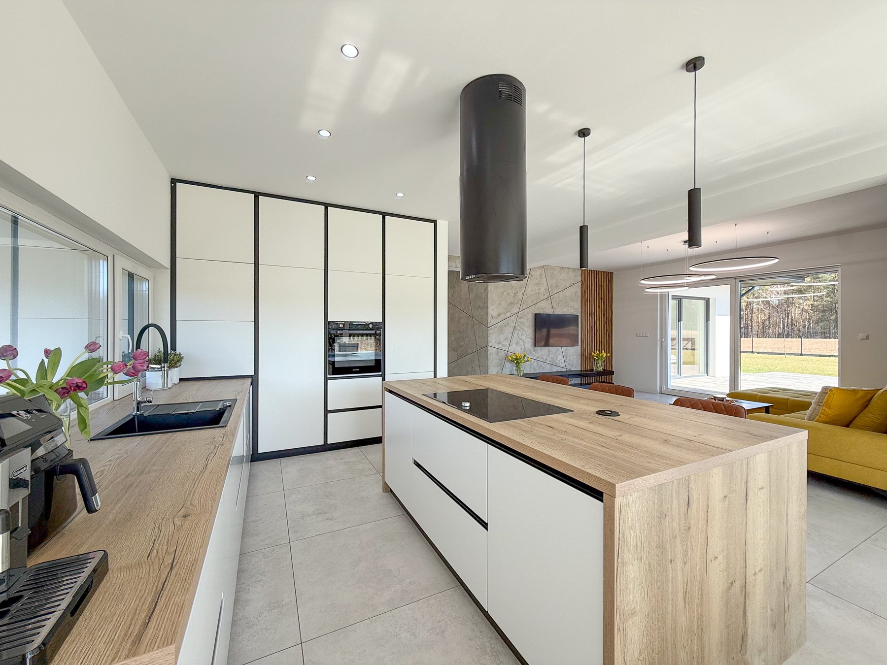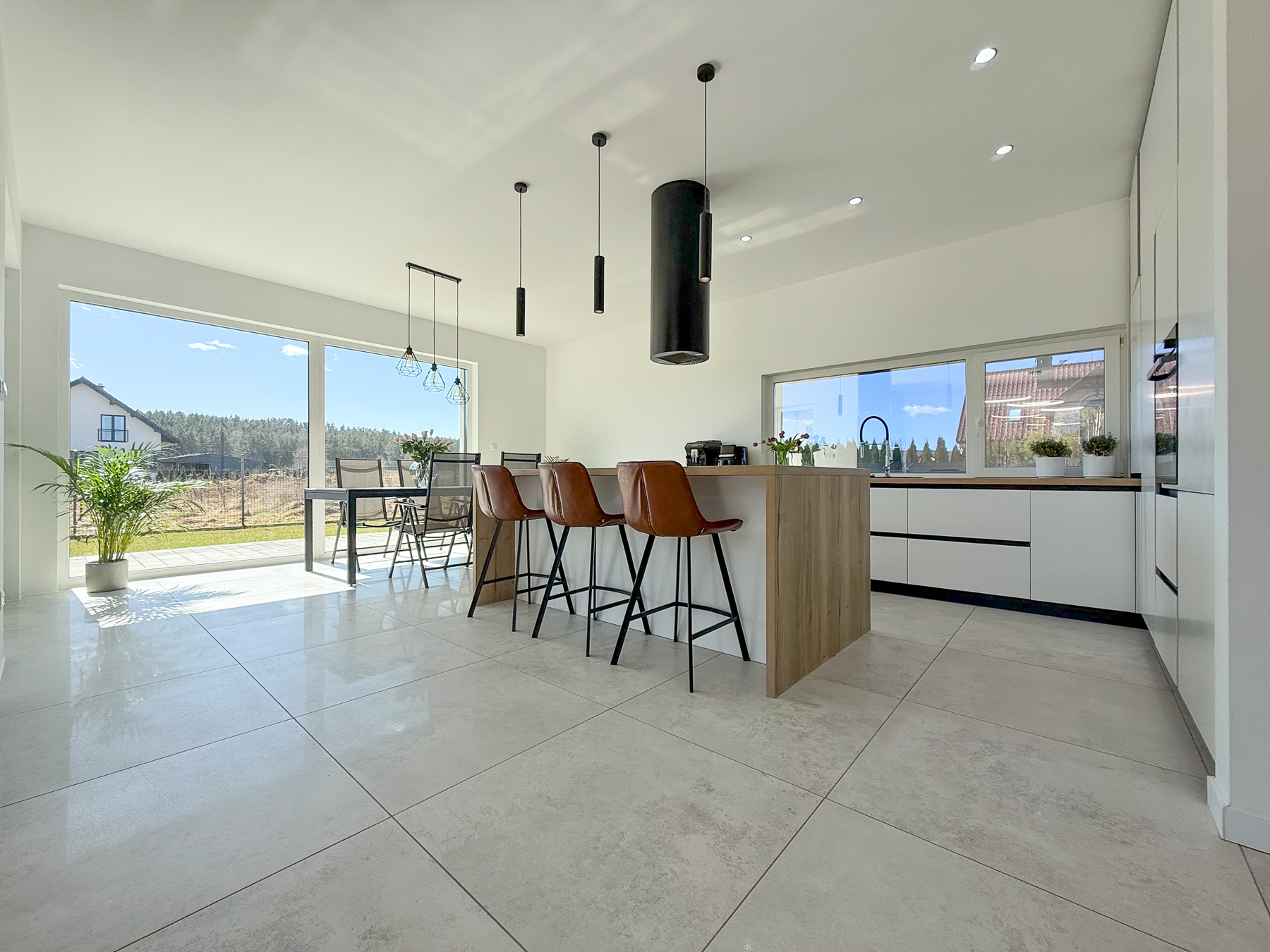 - salon o powierzchni 27,28 m2 urzeka swoją przestronnością. Z salonu wyjście na taras, zewnętrzną strefę wypoczynku z widokiem na las rozciągający się w oddali,