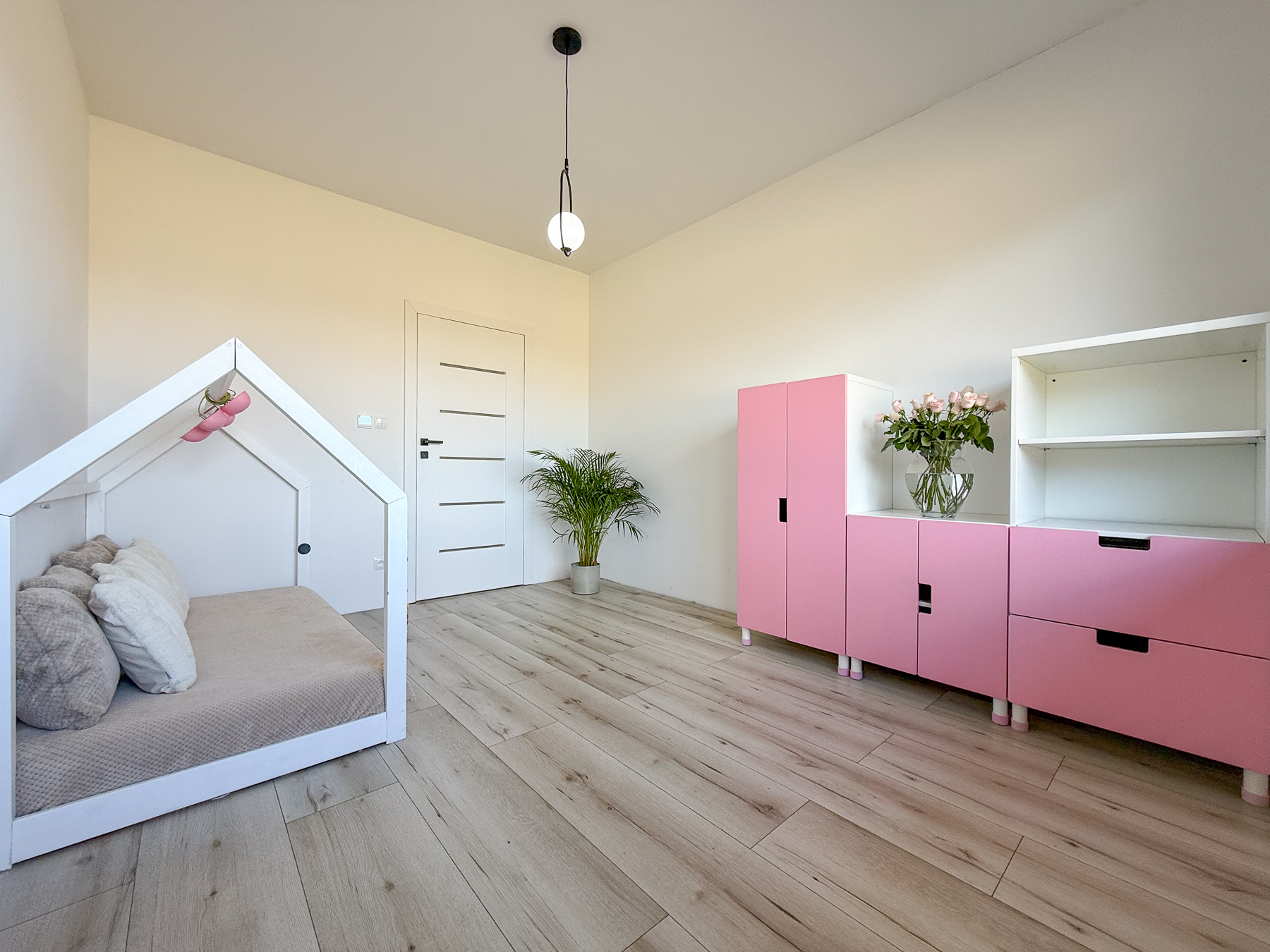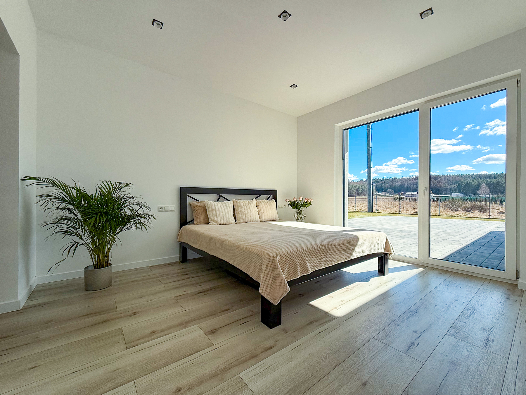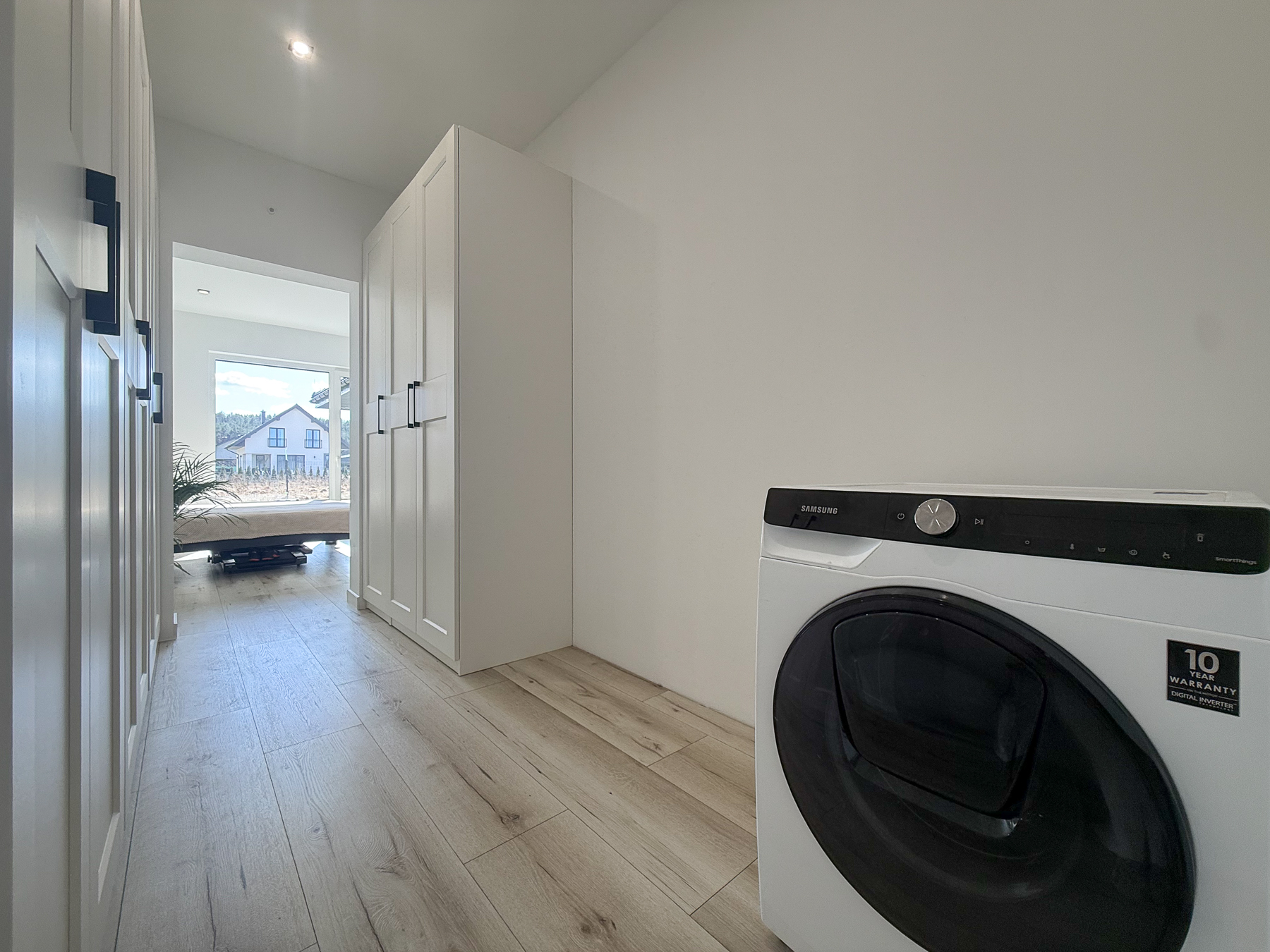 - trzy sypialnie (12,15 m2, 12,15 m2, ok. 15,70 m2) z widokiem na ogród, z głównej sypialni wyjście na taras, największa sypialnia posiada osobną garderobę połączoną z pralnią (8,18 m2),
