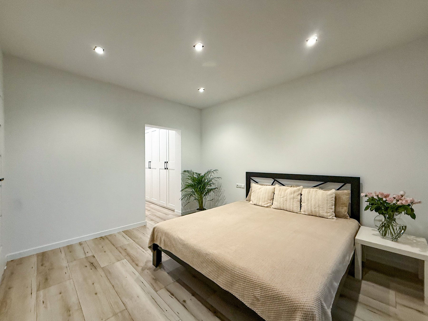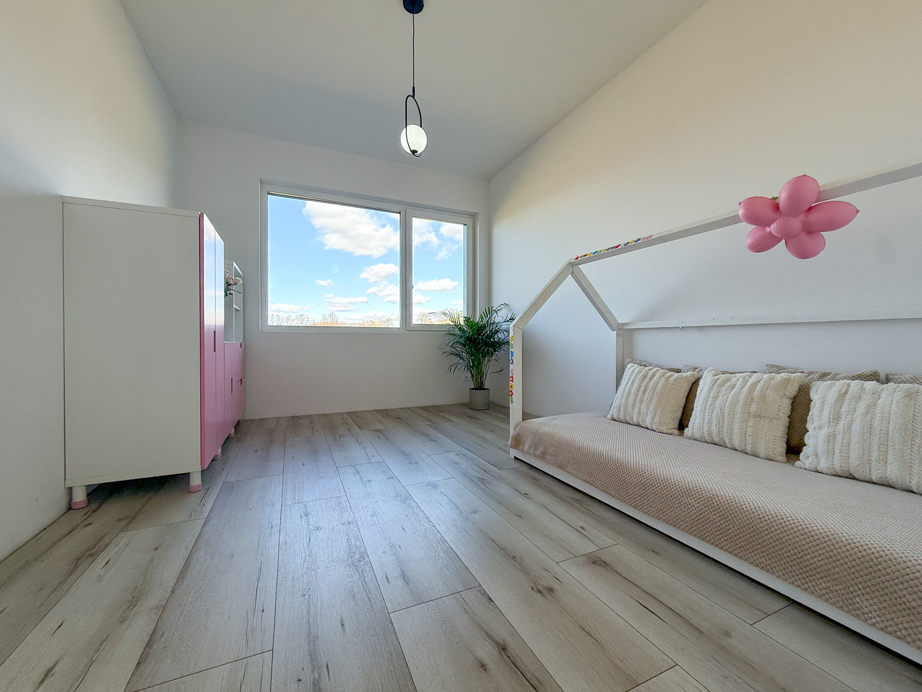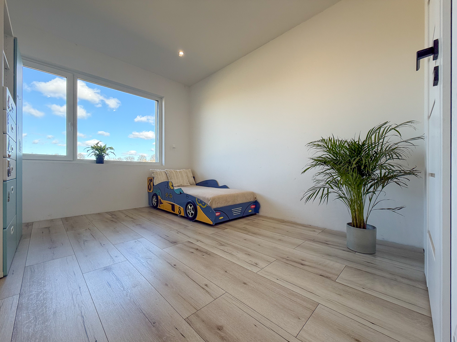 - trzy sypialnie (12,15 m2, 12,15 m2, ok. 15,70 m2) z widokiem na ogród, z głównej sypialni wyjście na taras, największa sypialnia posiada osobną garderobę połączoną z pralnią (8,18 m2),