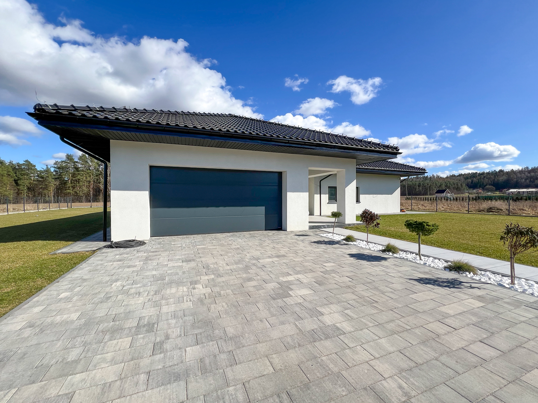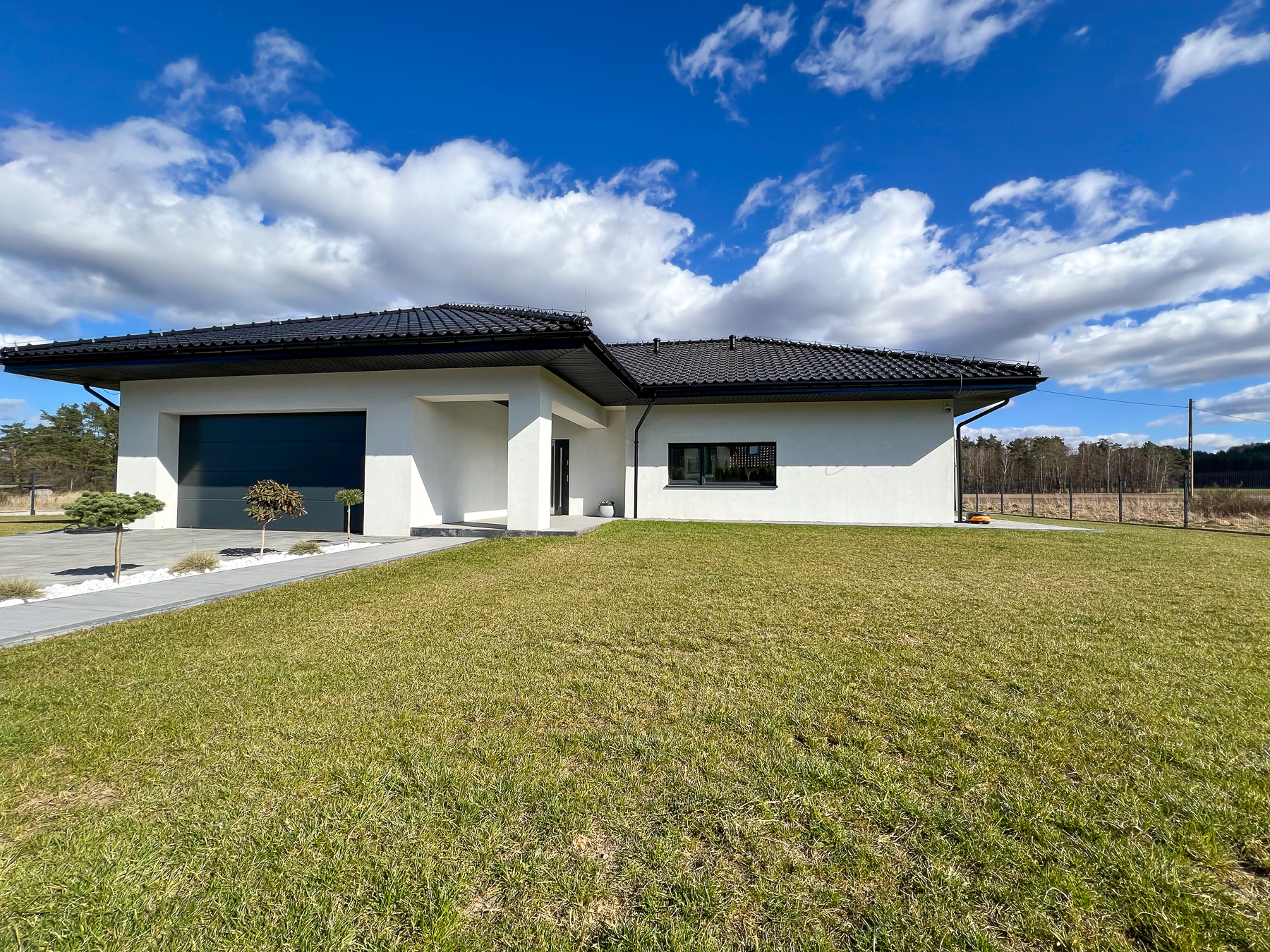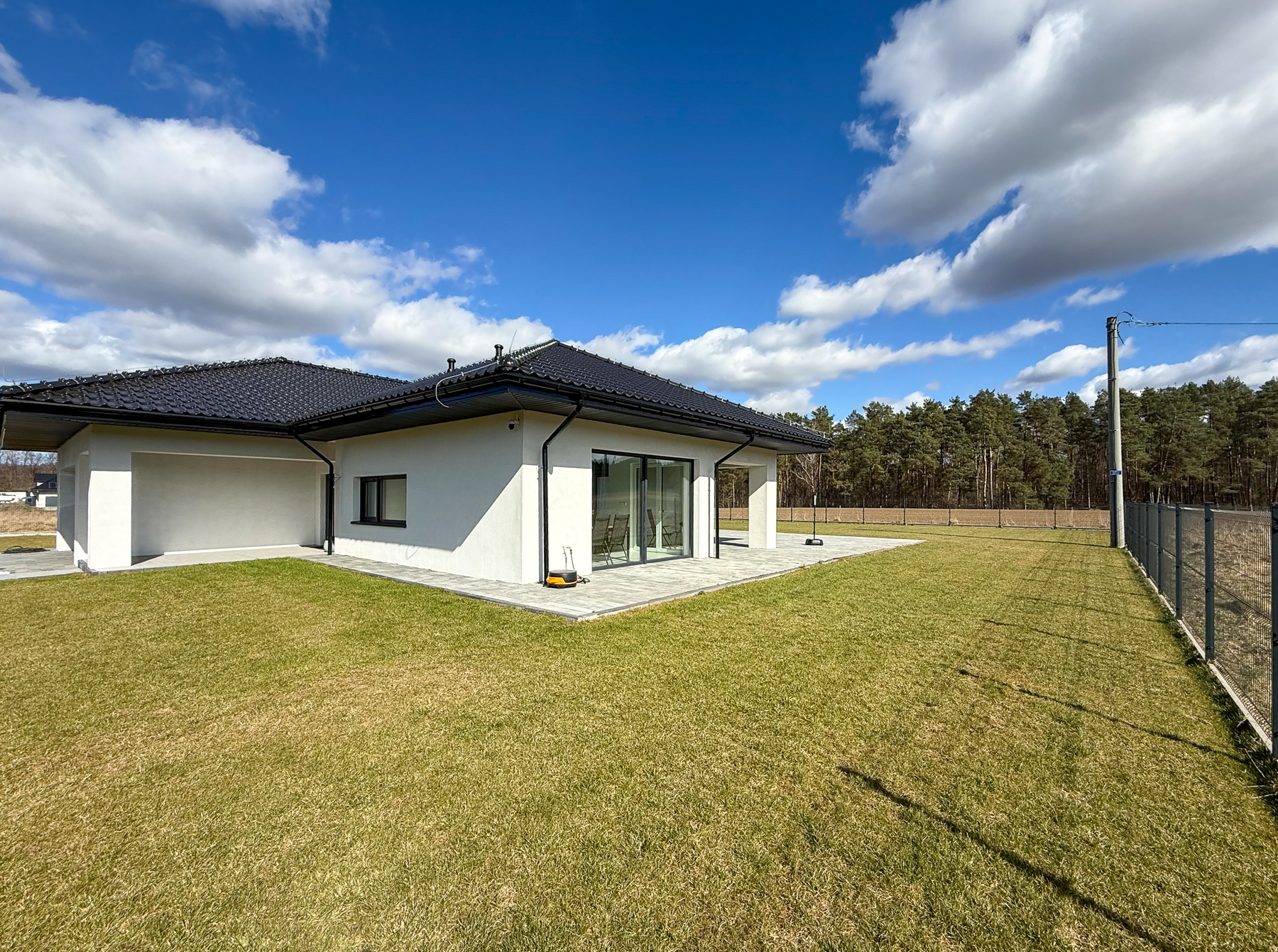 Duży teren wokół domu to idealna przestrzeń do zabaw dla dzieci i zwierząt domowych. Zaciszny wypielęgnowany i zadbany ogród ze słonecznym tarasem. O teren zielony wokół domu dba rozprowadzony system inteligentnej kosiarki.