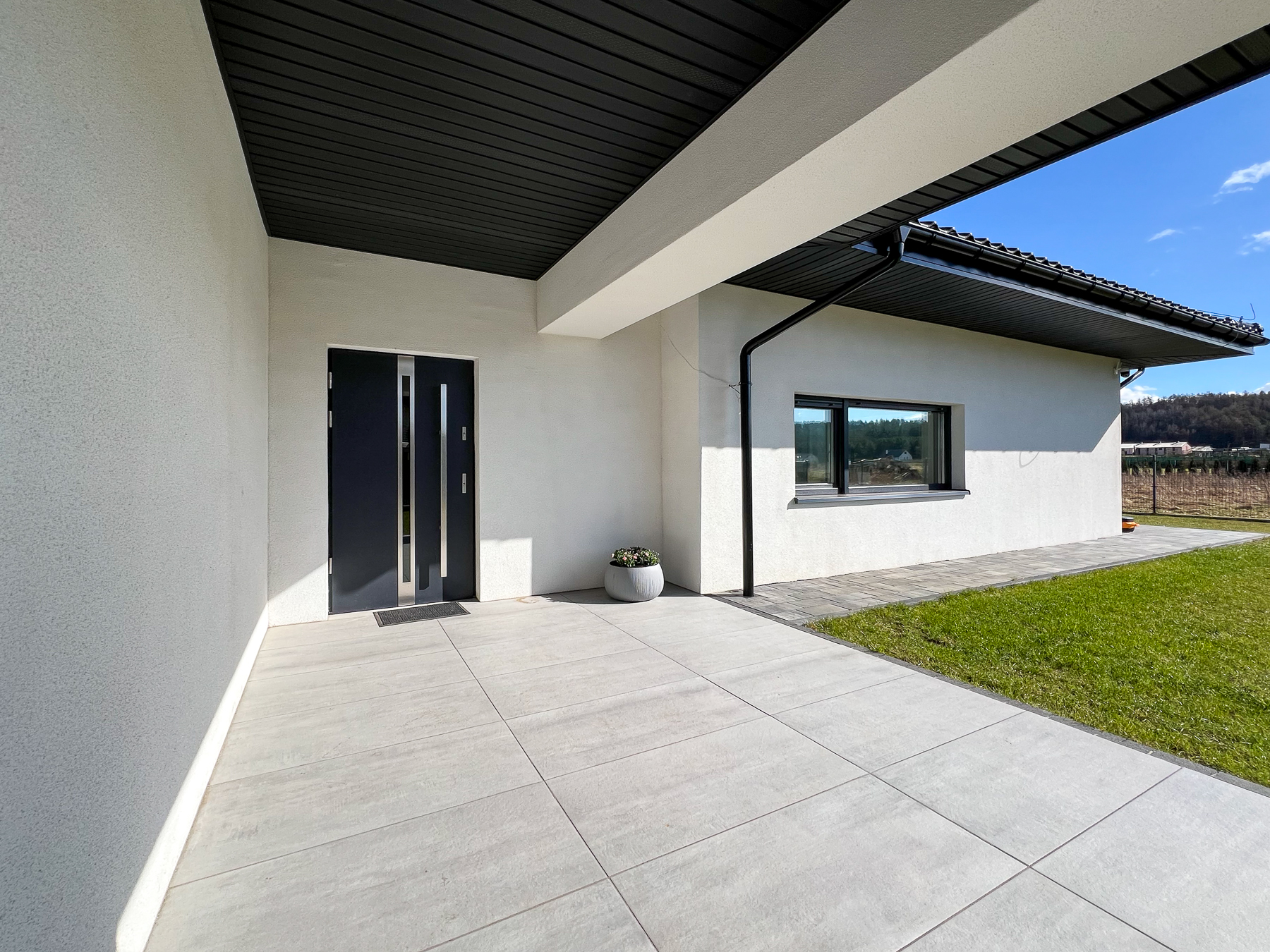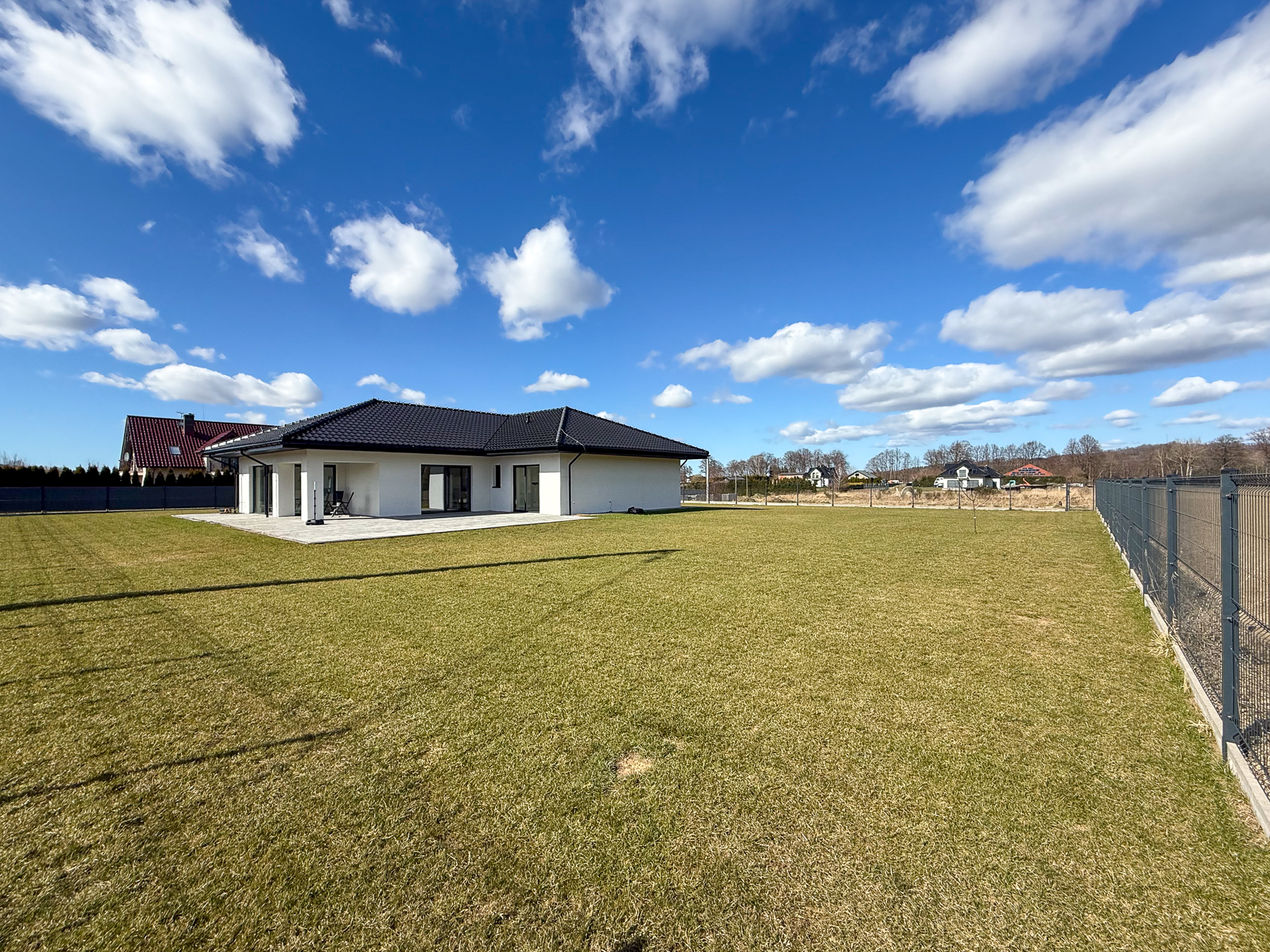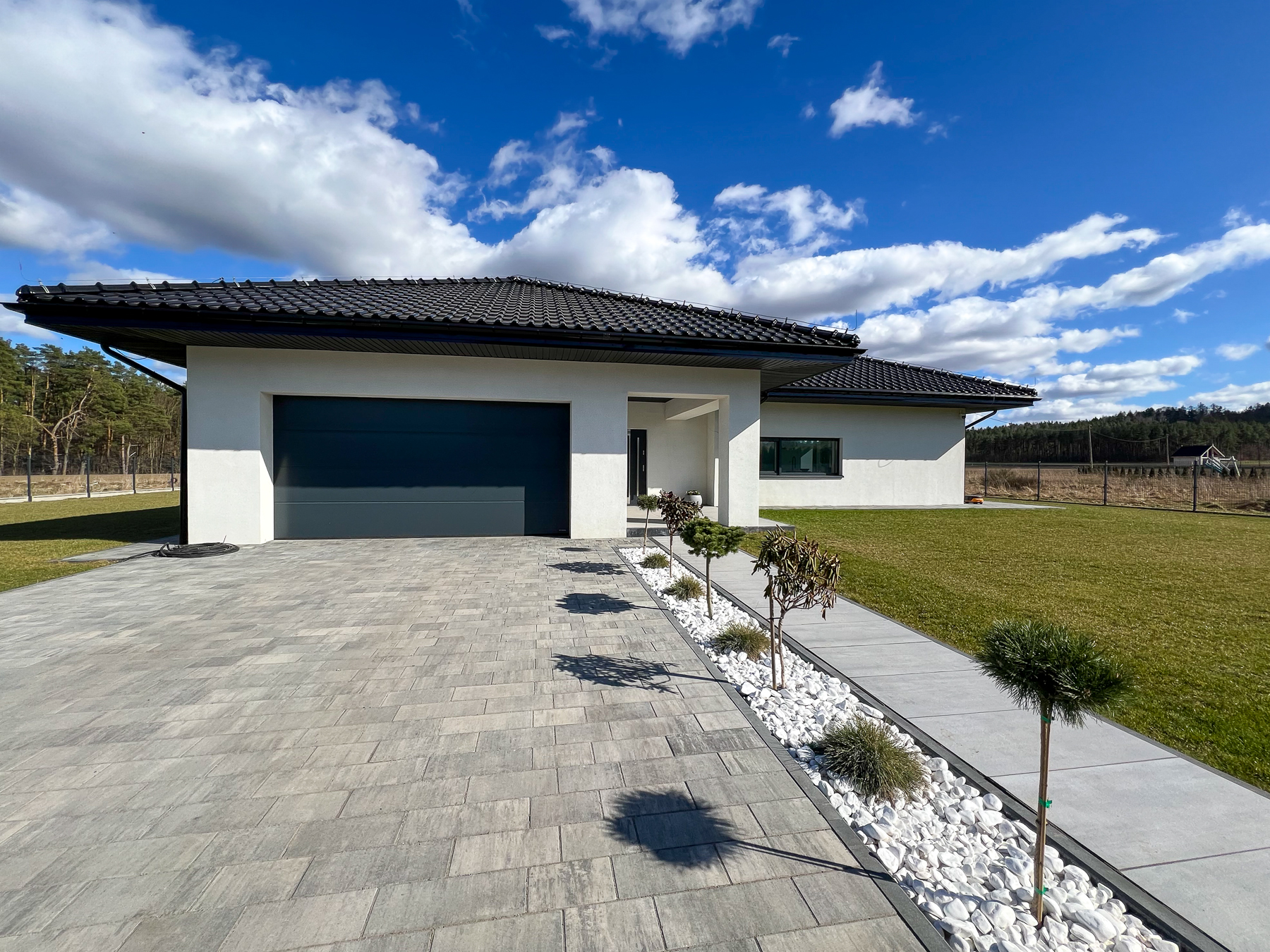 Duży teren wokół domu to idealna przestrzeń do zabaw dla dzieci i zwierząt domowych. Zaciszny wypielęgnowany i zadbany ogród ze słonecznym tarasem. O teren zielony wokół domu dba rozprowadzony system inteligentnej kosiarki.