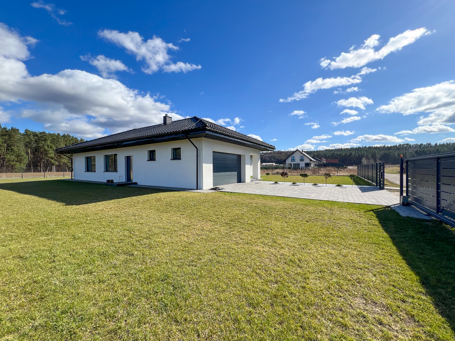 Elektryczna brama wjazdowa oraz teren całkowicie ogrodzony zapewniają poczucie bezpieczeństwa i komfort mieszkańców.