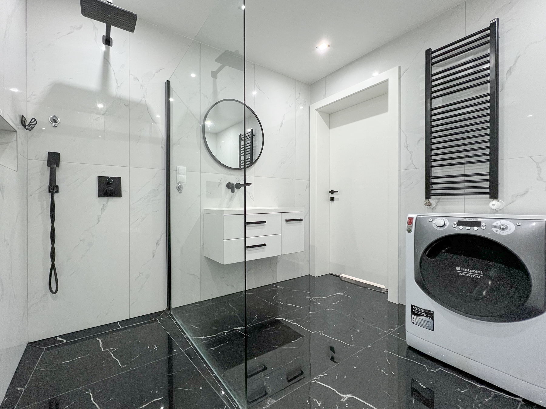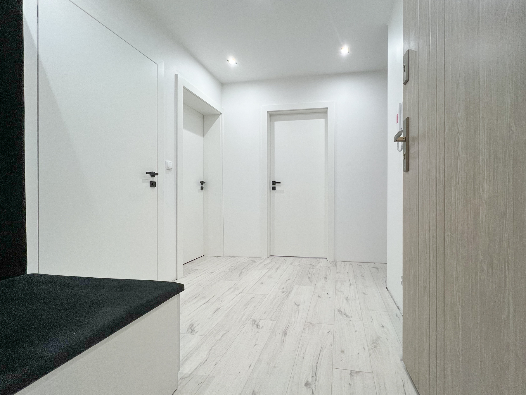 Wnętrze kryje dwie ustawne sypialnie (pow. ok. 16 m2, 12 m2), komunikację (pow. ok. 5,5 m2), efektownie urządzoną łazienkę (pow. ok. 7 m2) z kabiną prysznicową z odpływem liniowym.