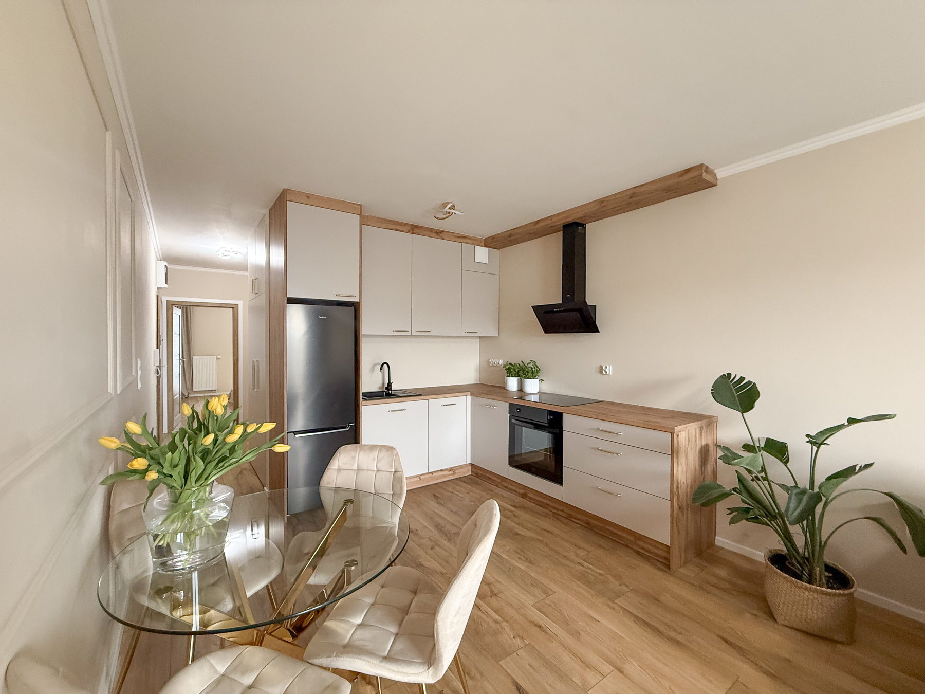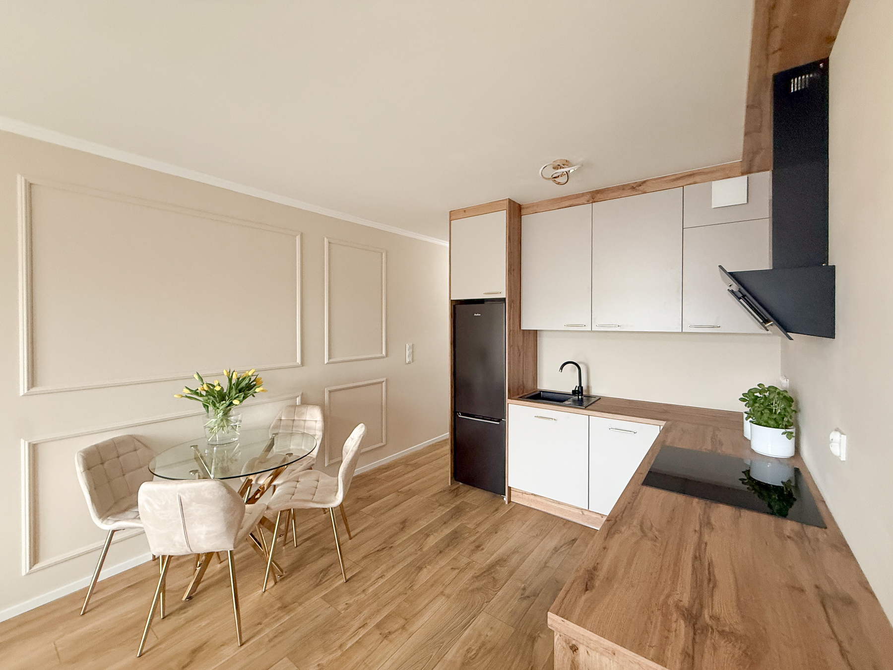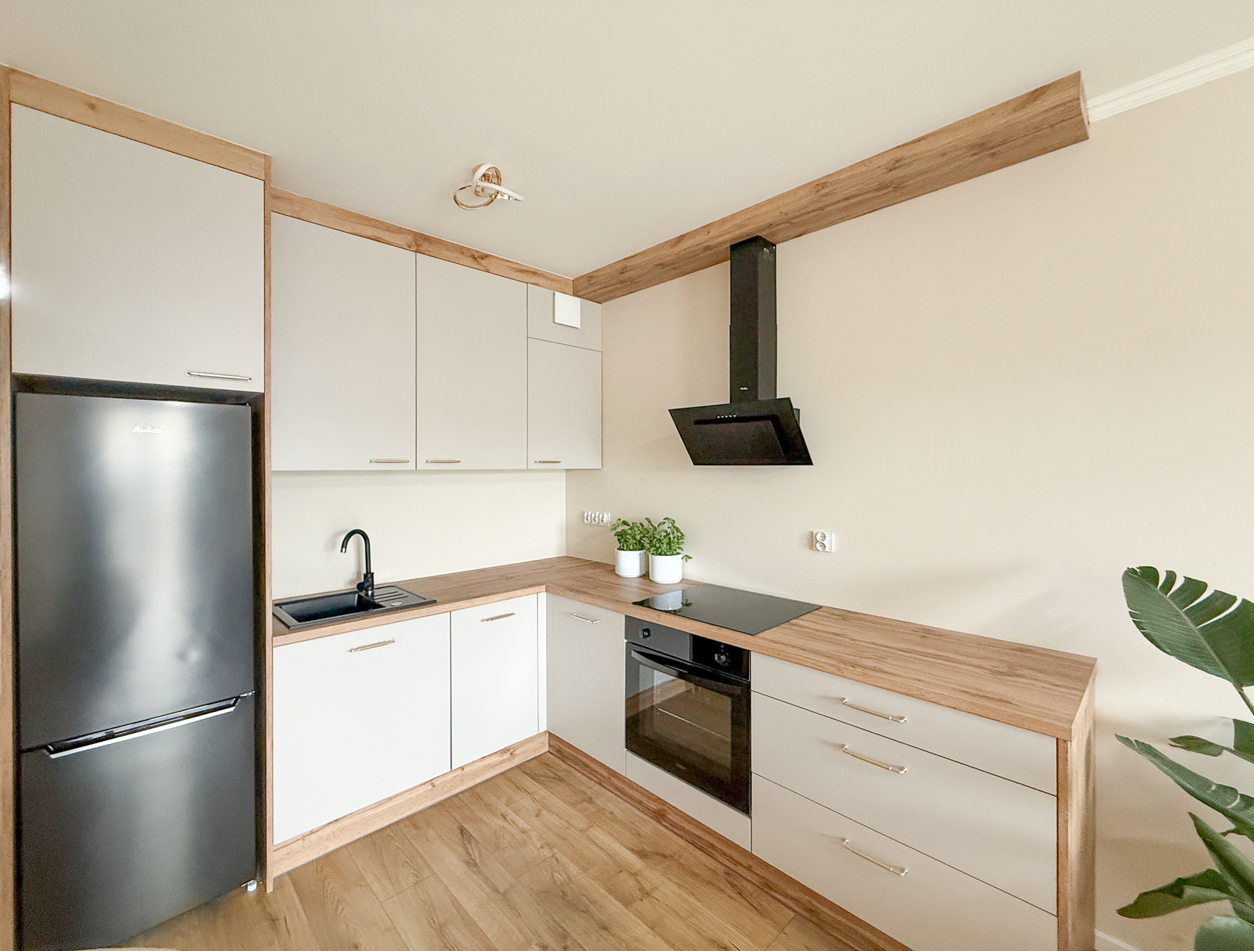 Aneks kuchenny zaprojektowany w nowoczesnym, funkcjonalnym stylu-komfortowa zabudowa kuchenna oferuje dużo miejsca do przechowywania oraz pełne wyposażenie AGD (piekarnik, zmywarka, lodówka, płyta indukcyjna, okap).