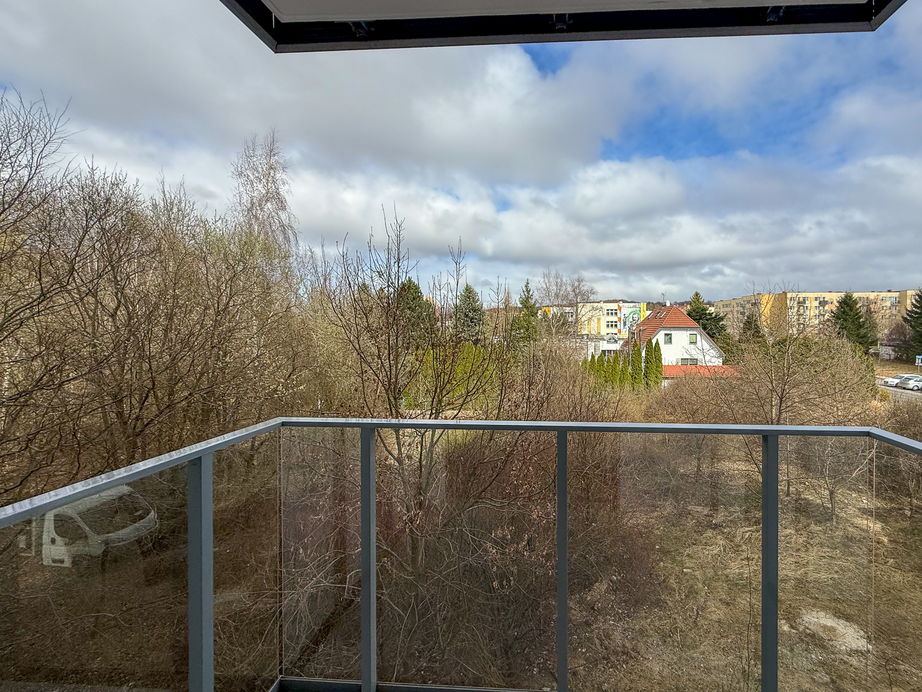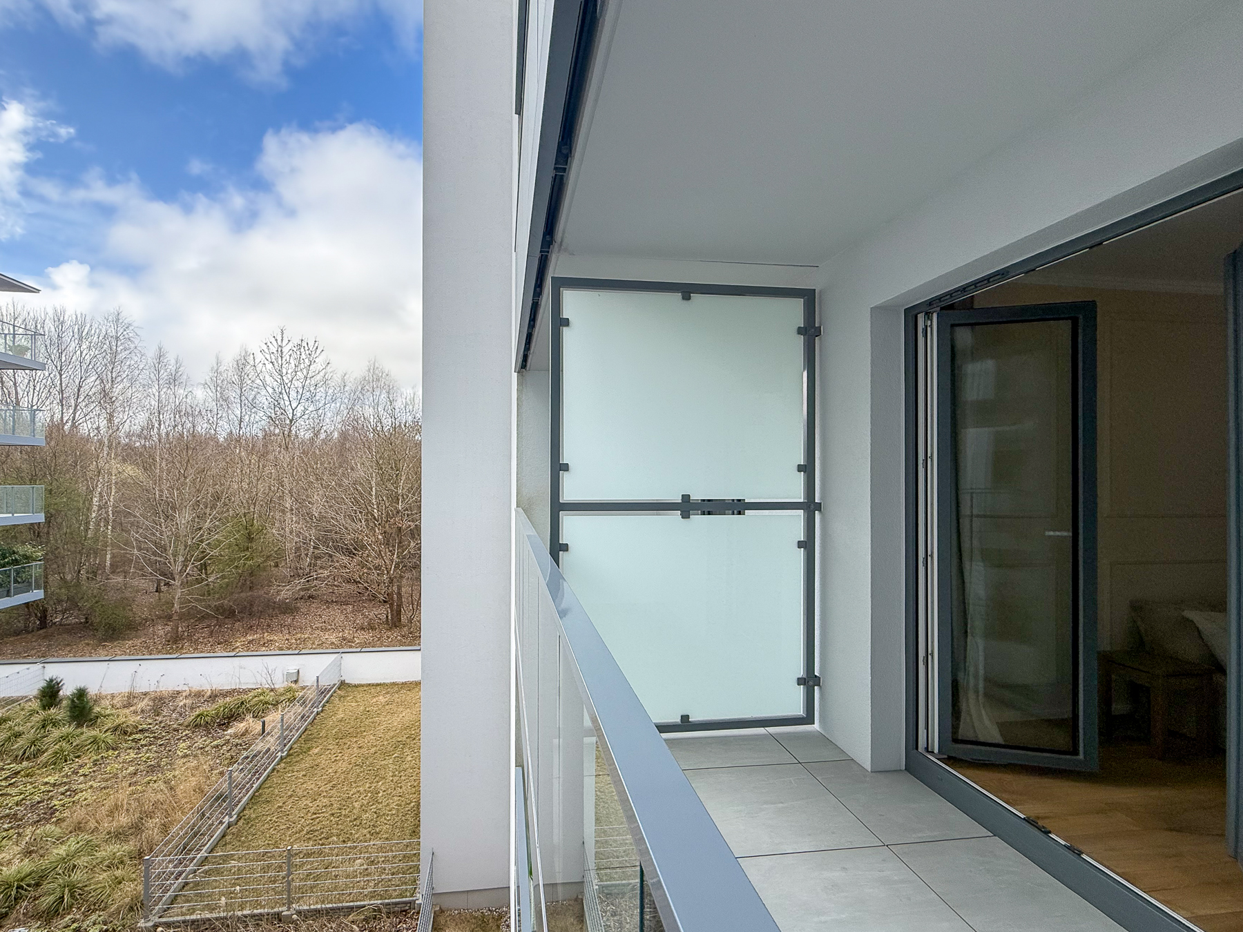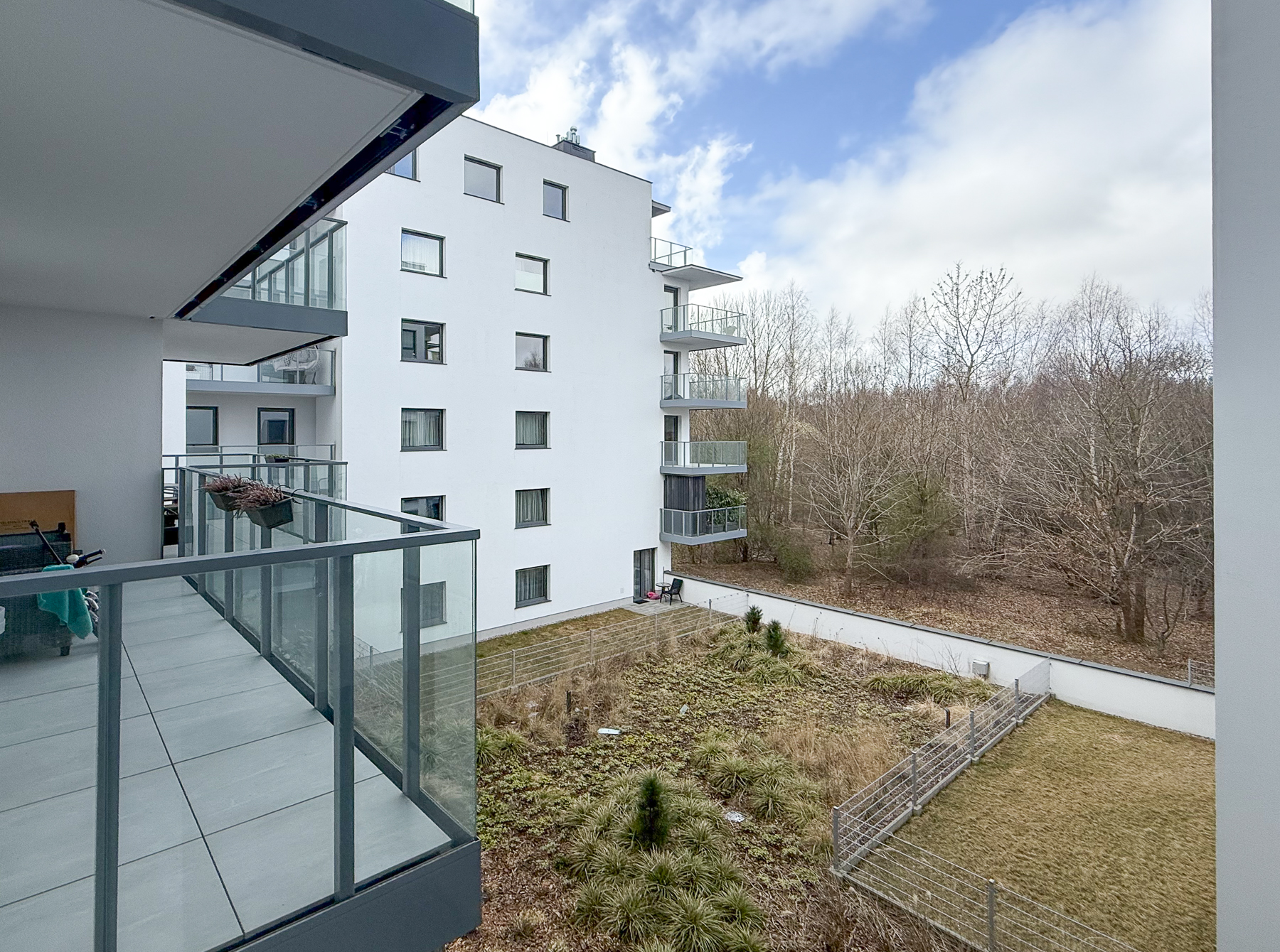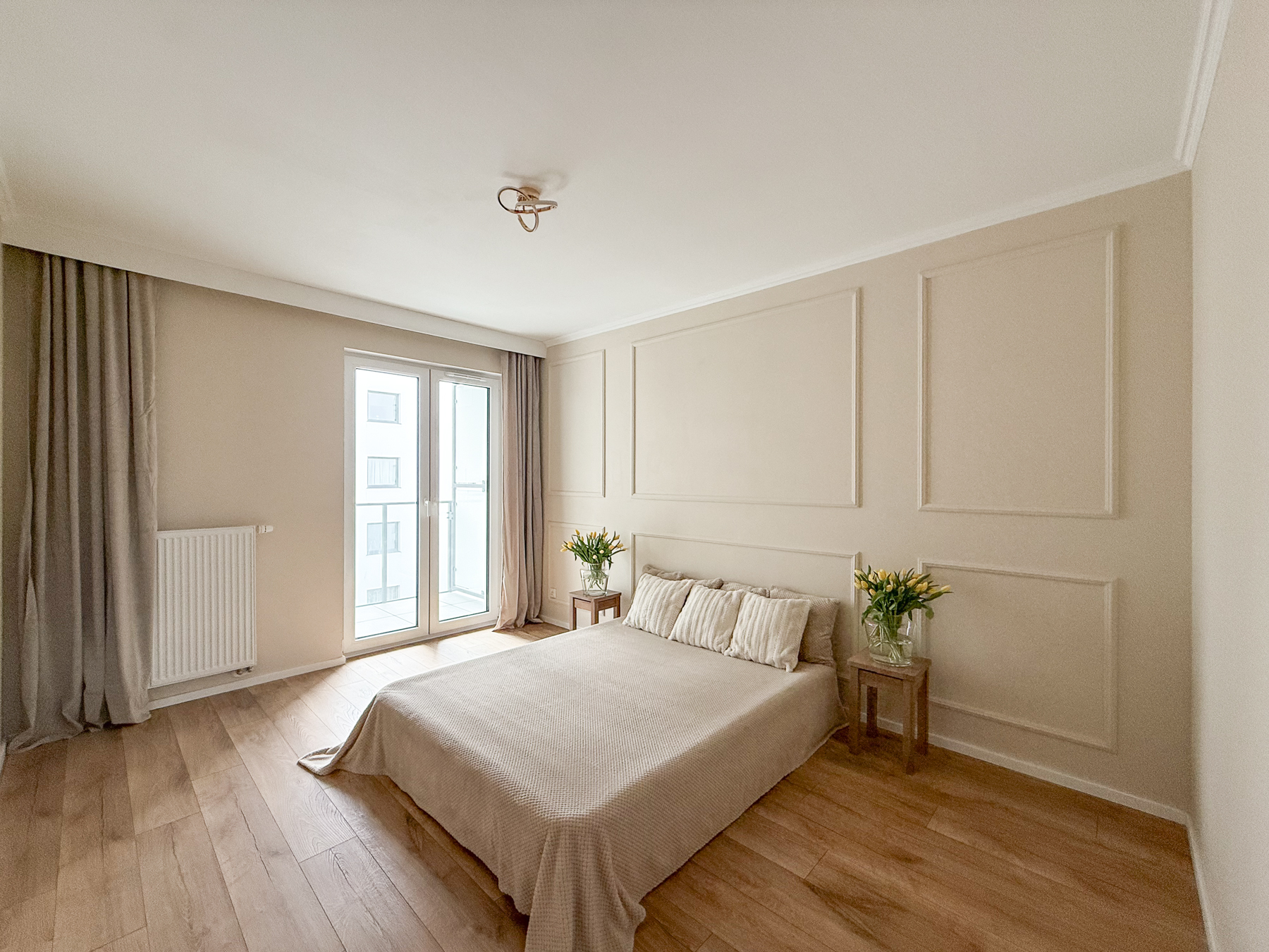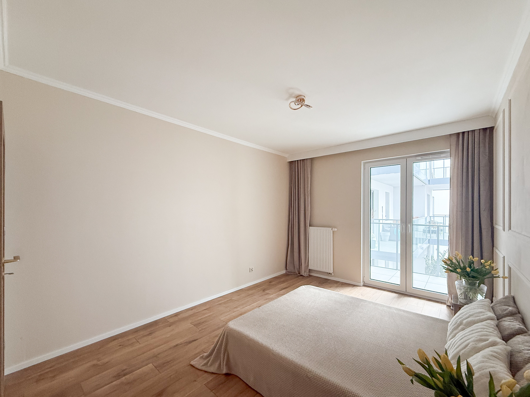 Ustawna sypialnia z wyjściem na drugi balkon, z widokiem na kameralną, zieloną przestrzeń z nasadzeniami i drzewami. Pomieszczenie pozostaje do własnej aranżacji, co daje możliwość dopasowania go do indywidualnych potrzeb.