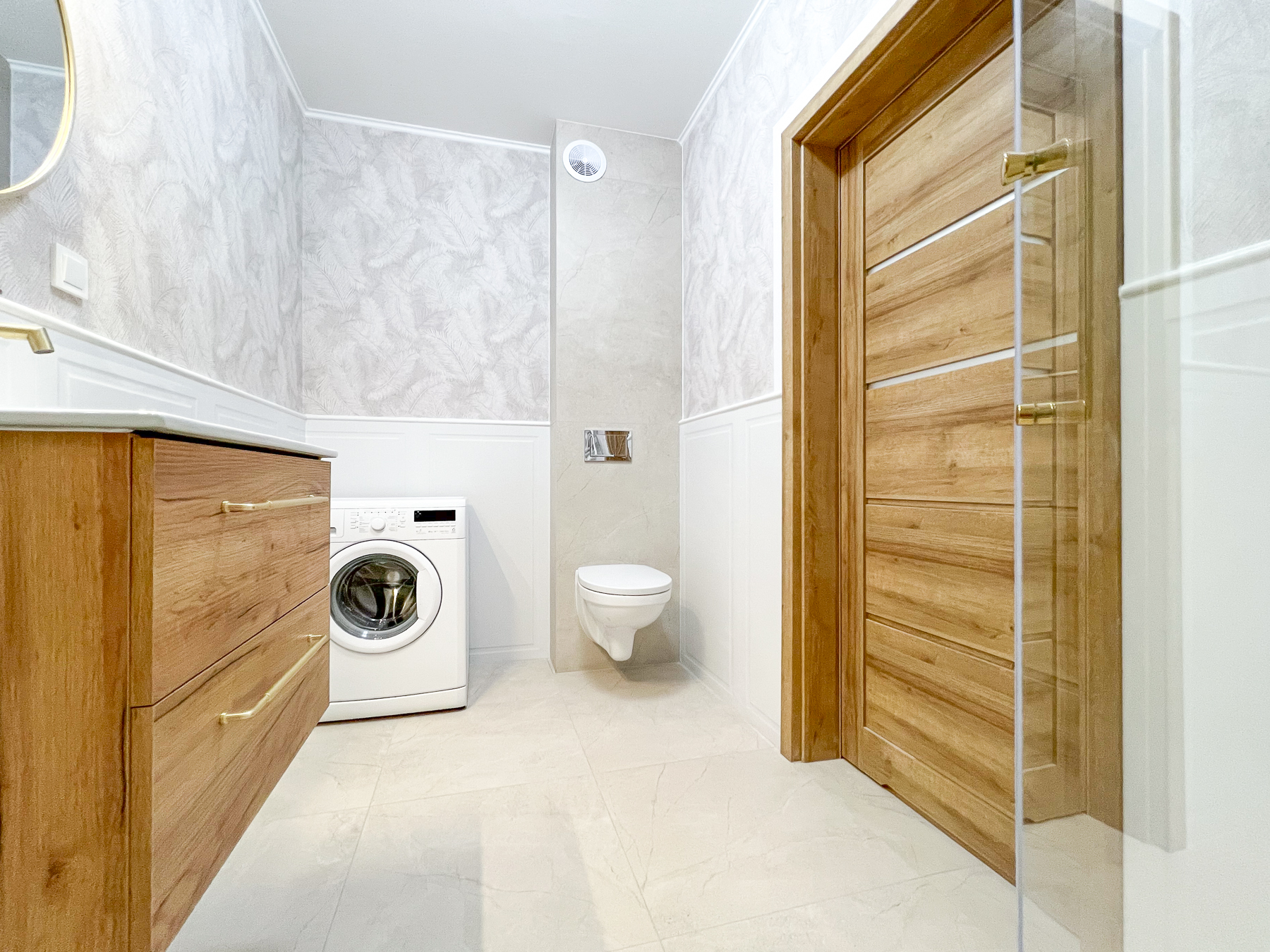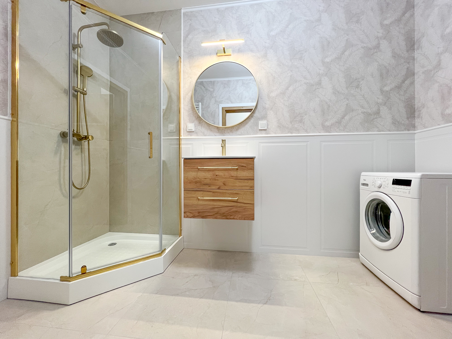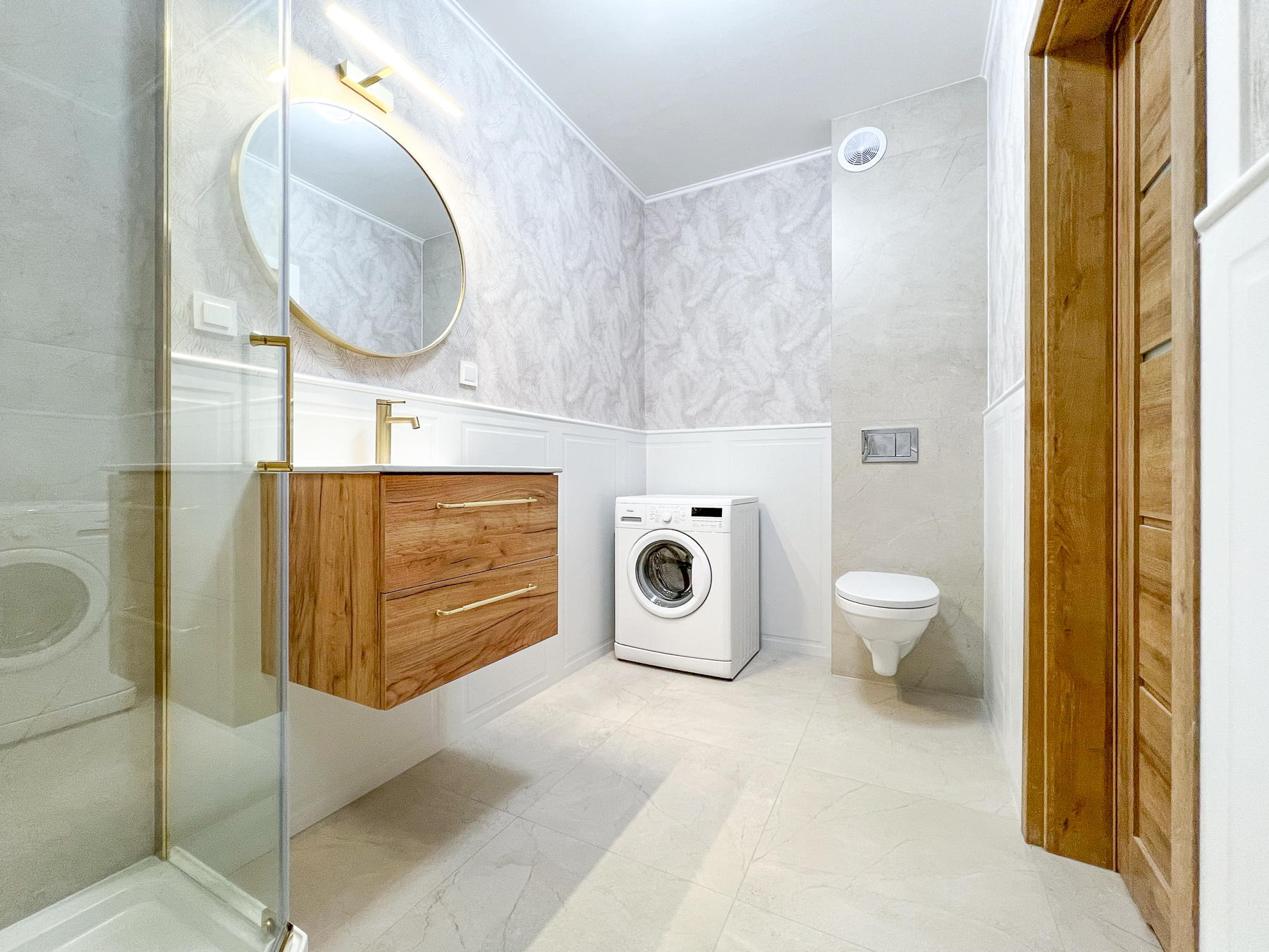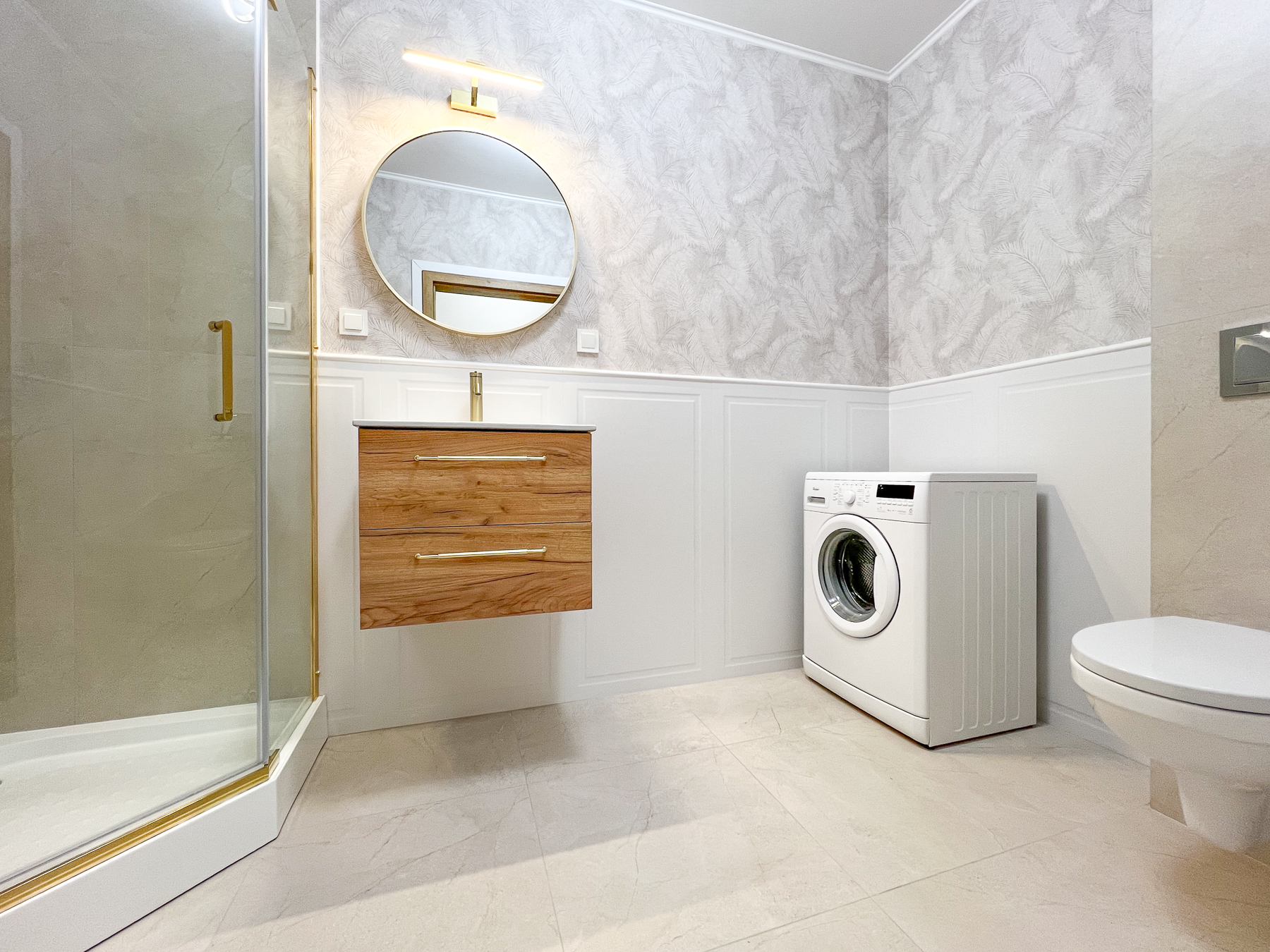 Nowoczesna łazienka wykończona w eleganckim, ponadczasowym stylu. Wyposażona w prysznic, umywalkę z szafką oraz pralkę.